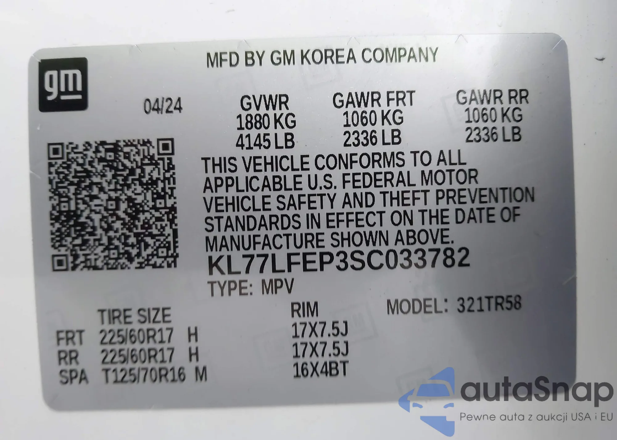 VIN: KL77LFEP3SC033782