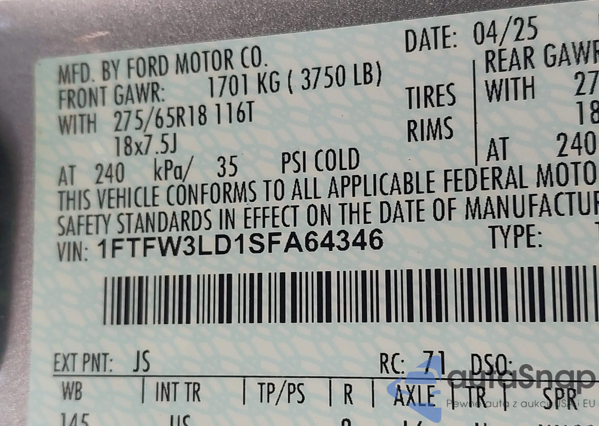 VIN: 1FTFW3LD1SFA64346