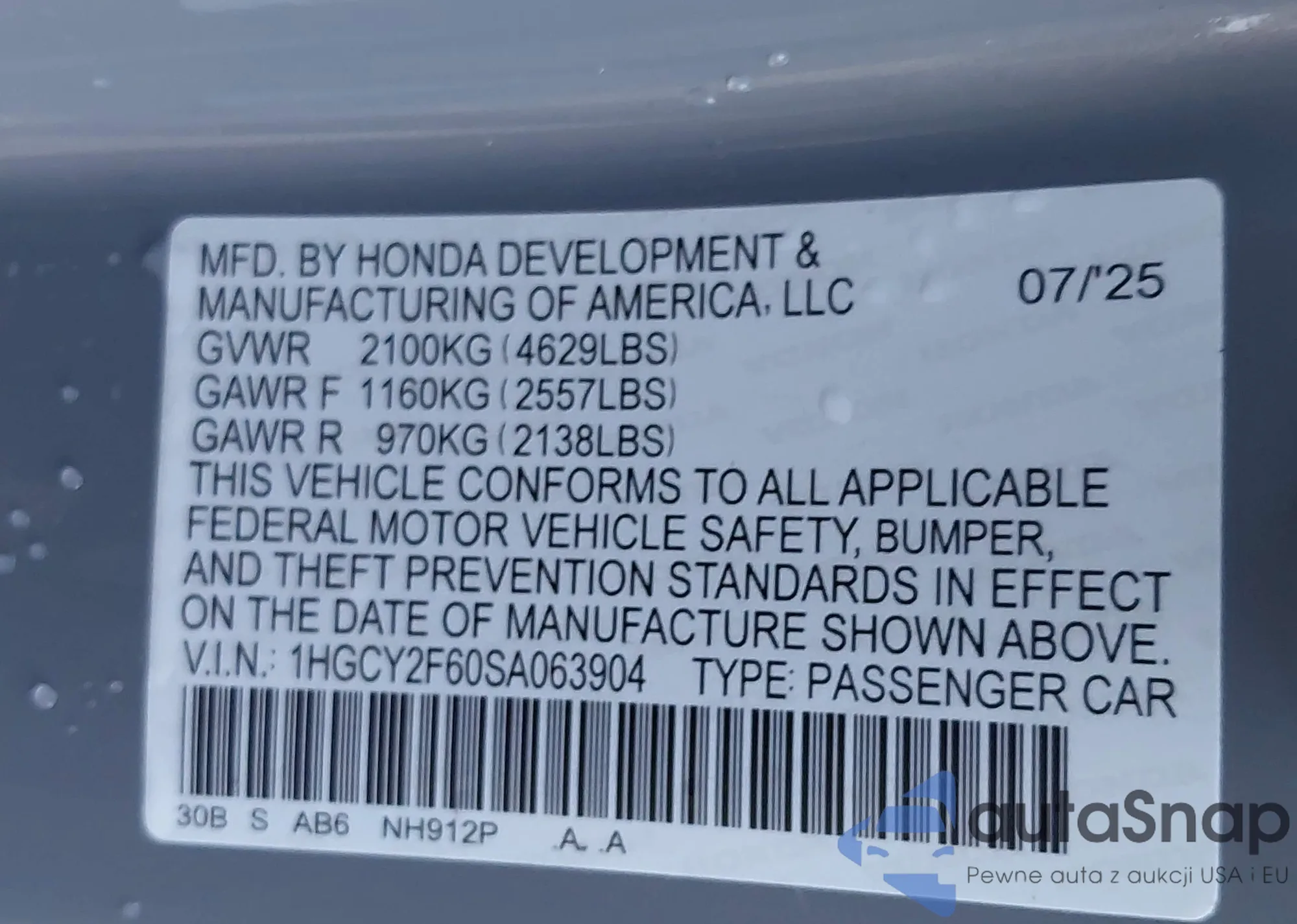 VIN: 1HGCY2F60SA063904