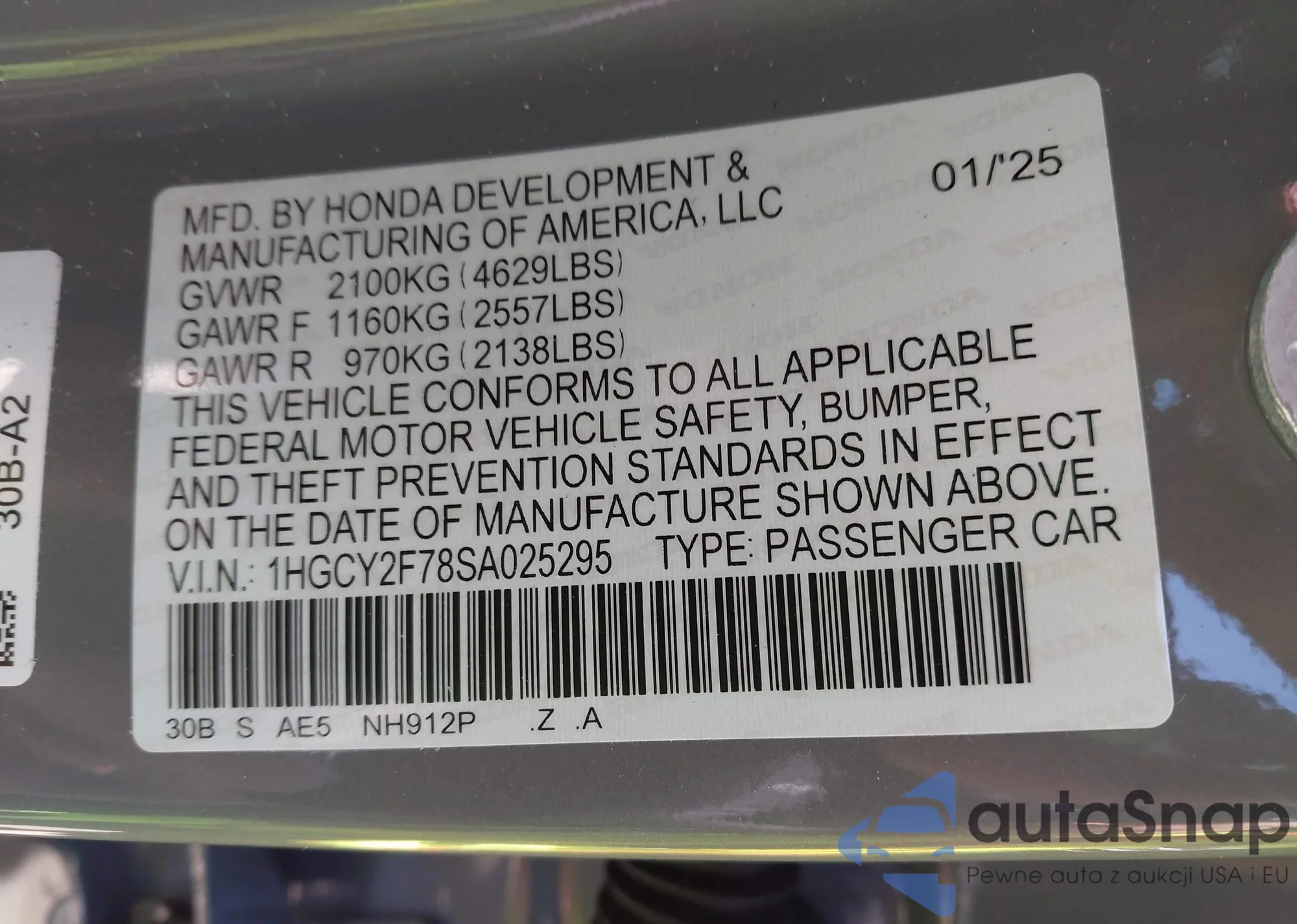• VIN: 1HGCY2F78SA025295