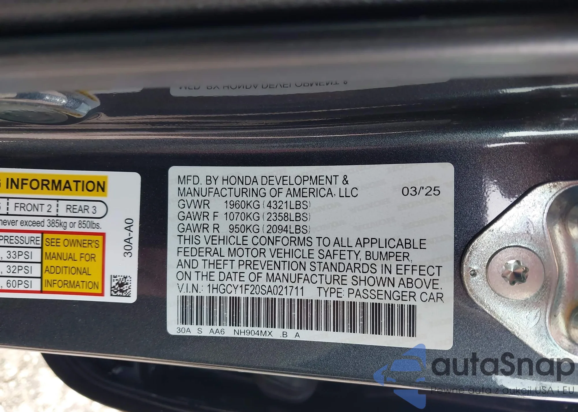 • VIN: 1HGCY1F20SA021711