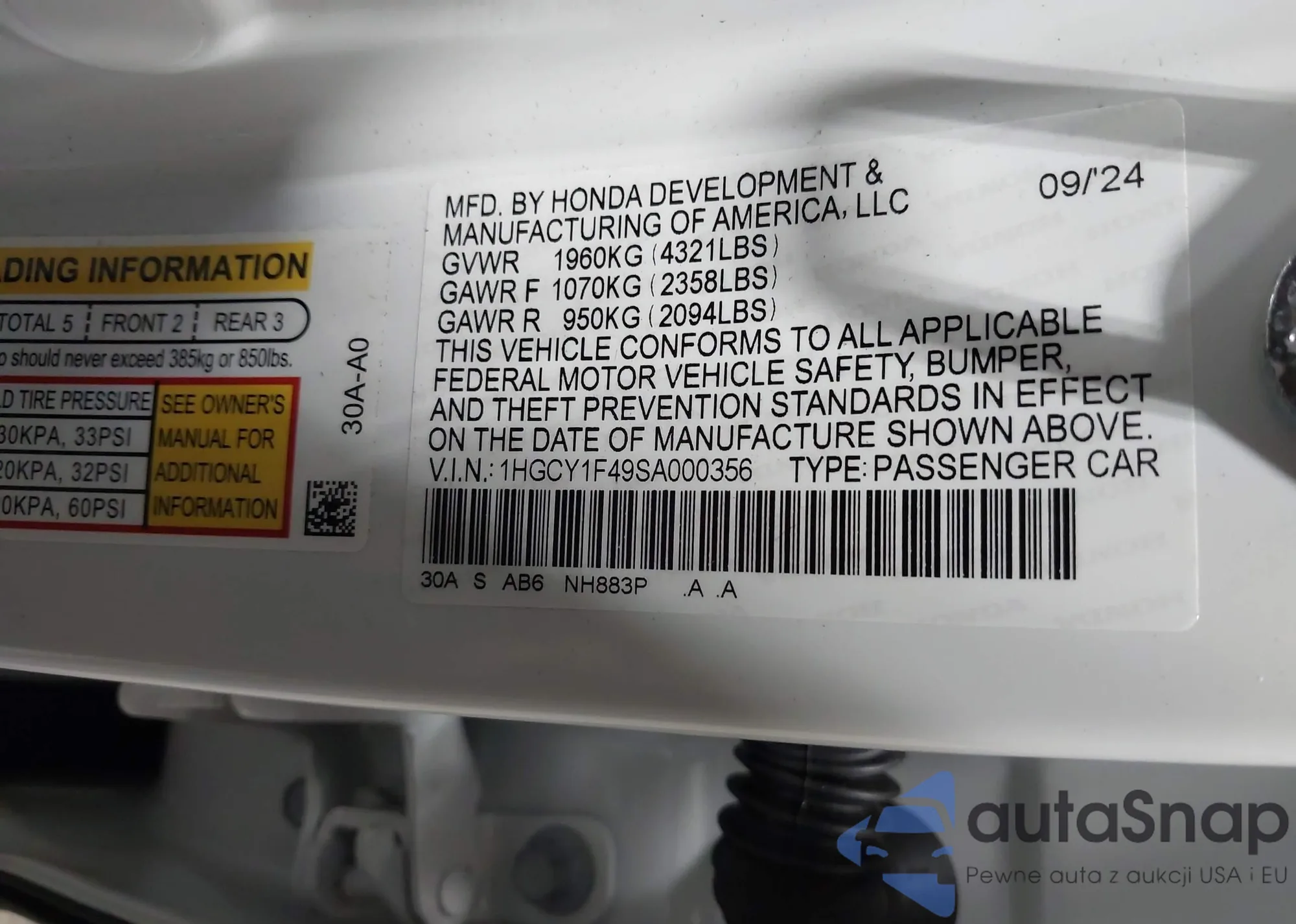 VIN: 1HGCY1F49SA000356