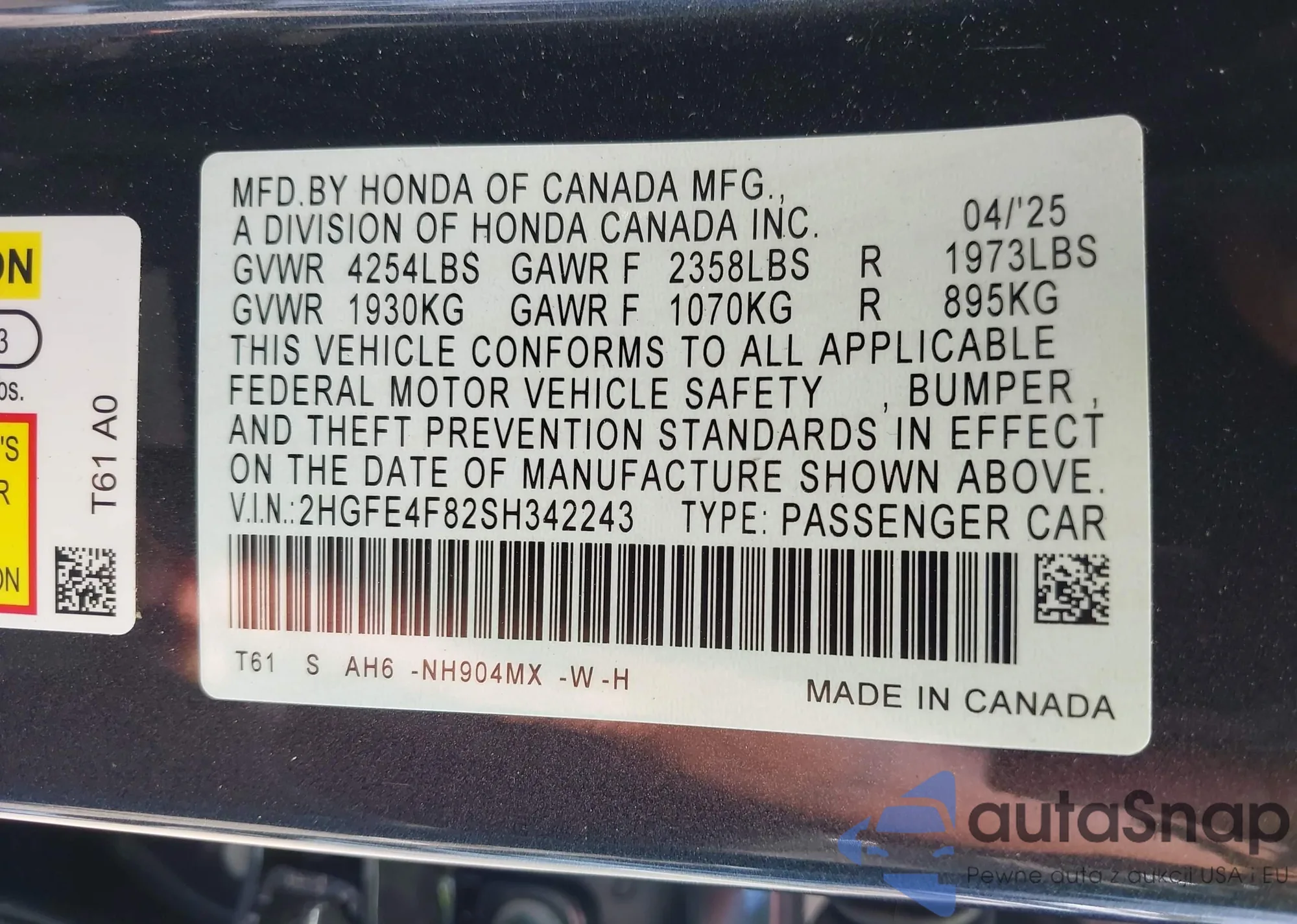 VIN: 2HGFE4F82SH342243