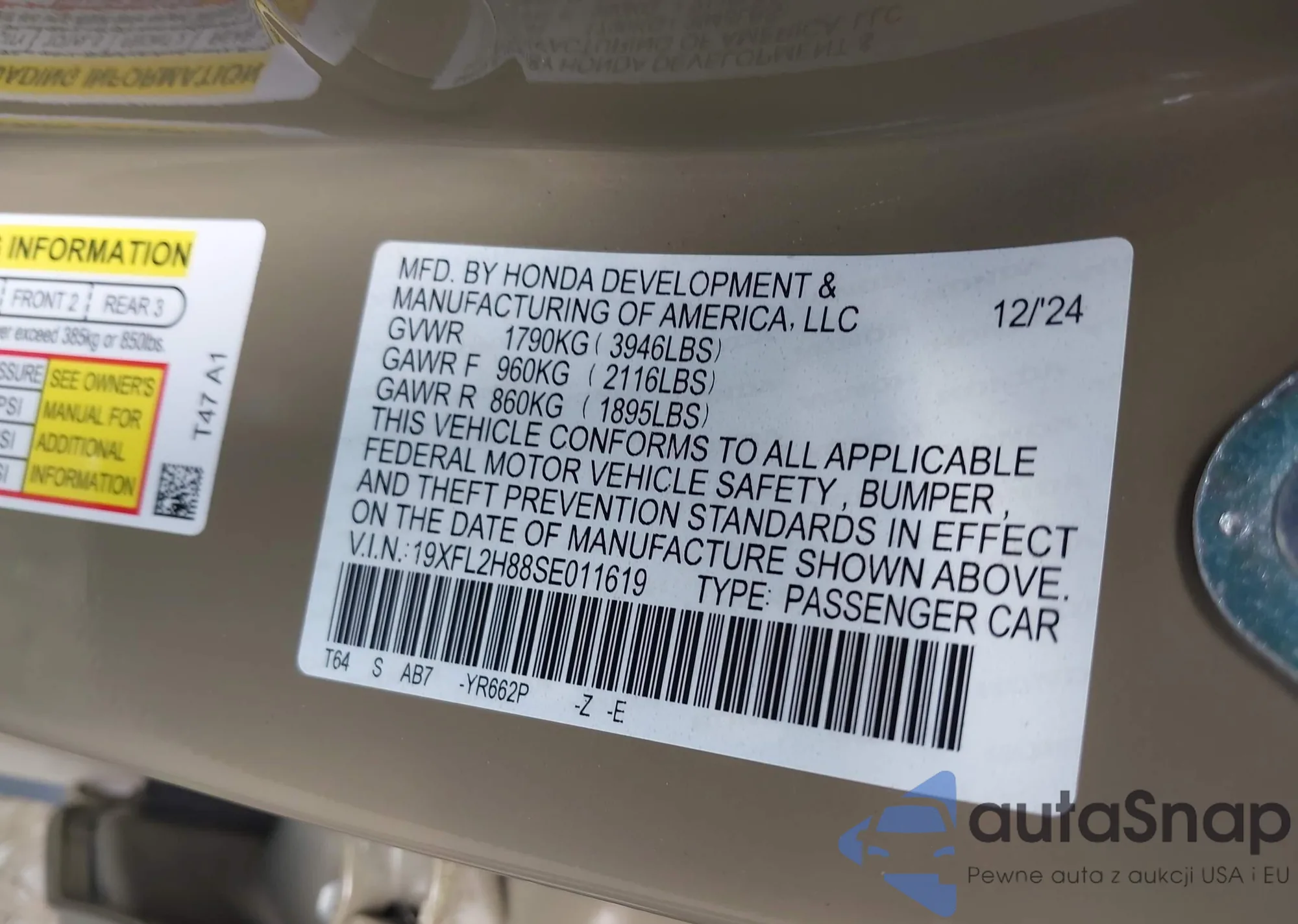 • VIN: 19XFL2H88SE011619