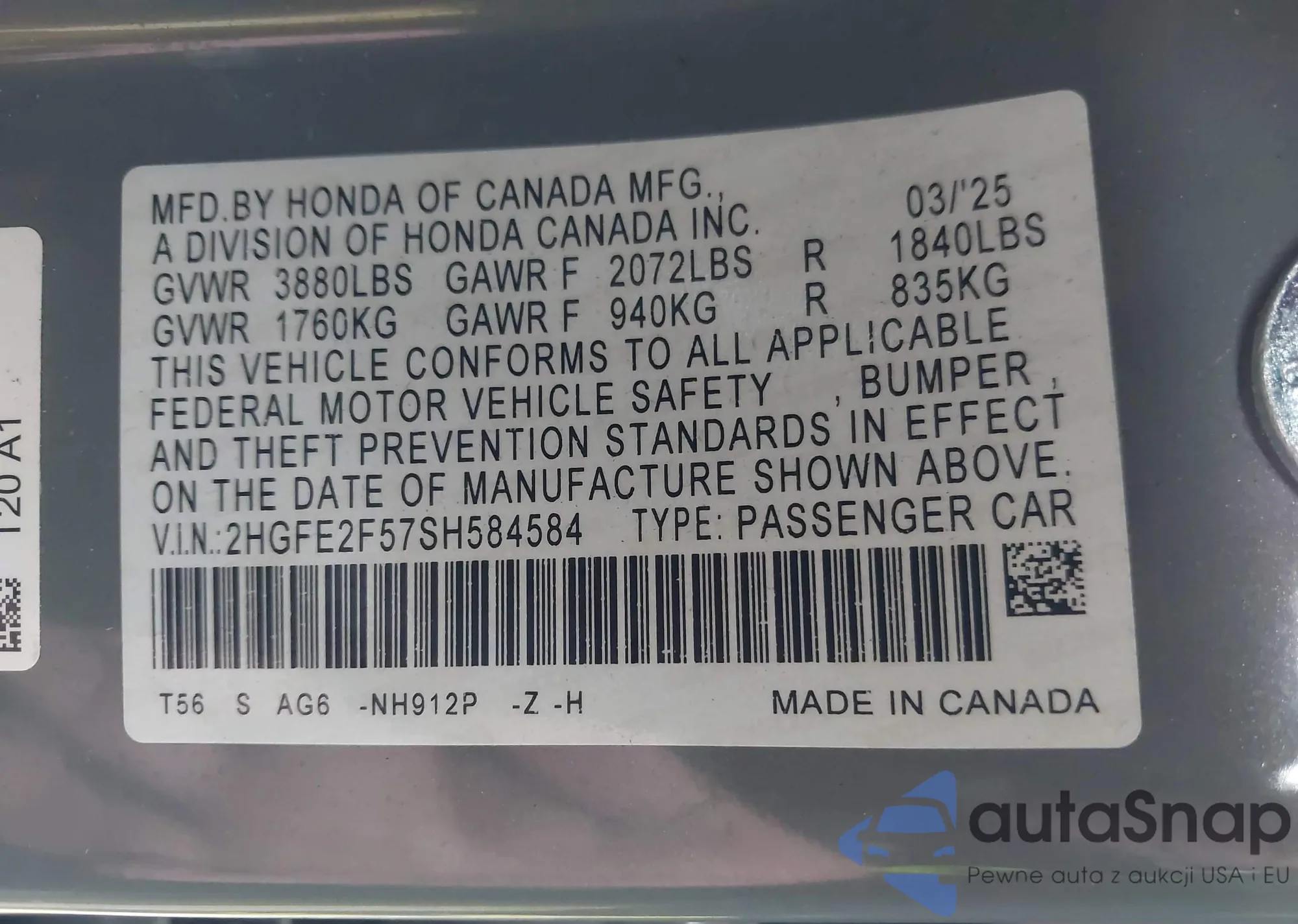 Автомобиль Honda Civic 2025 (VIN 2HGFE2F57SH584584) ранее не участвовал в торгах. Документы чистые, пробег соответствует или ниже среднего по рынку. Продаётся страховой компанией — рекомендуем покупку. Доставка в порт займет около 6–8 недель.
