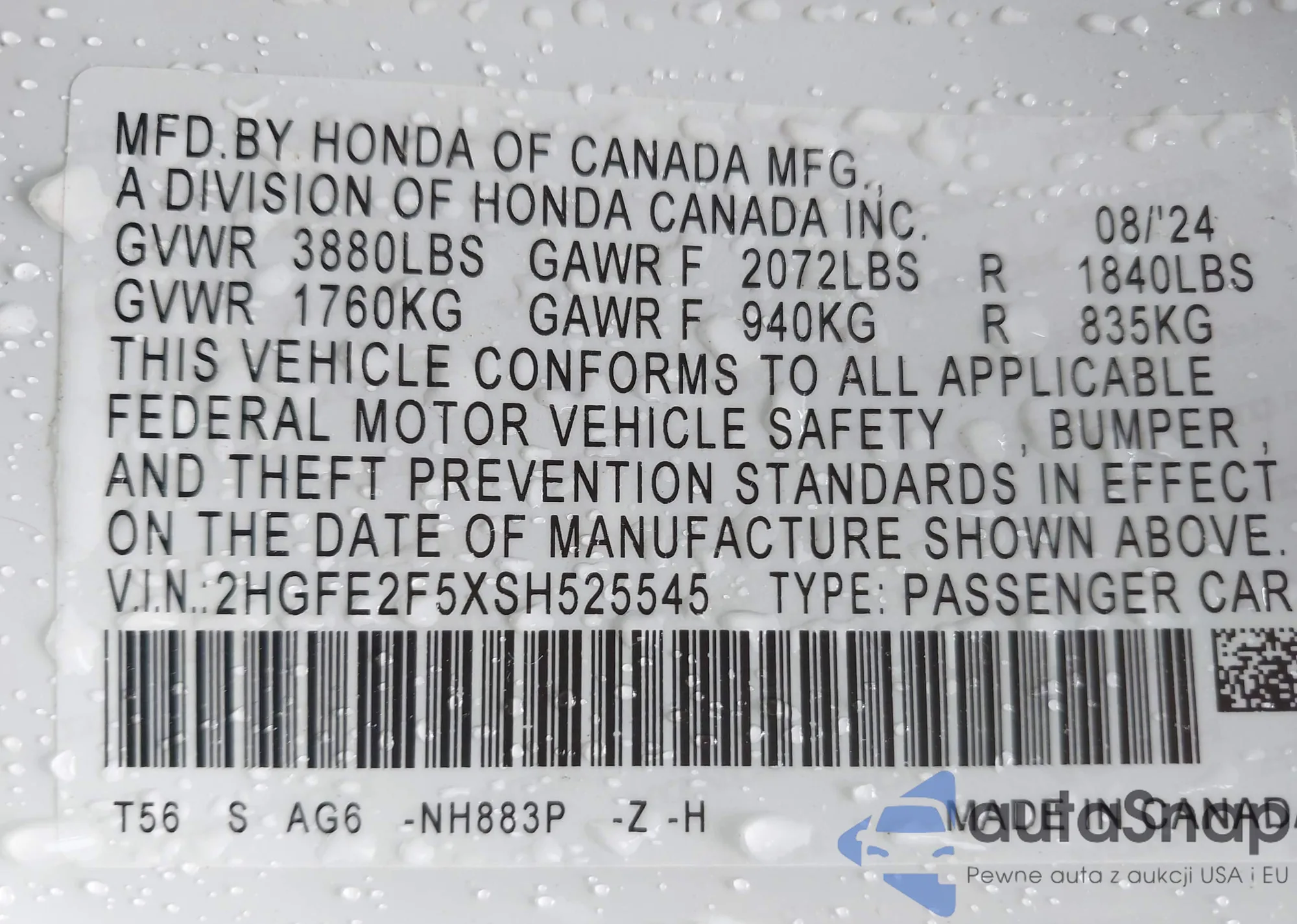 VIN: 2HGFE2F5XSH525545