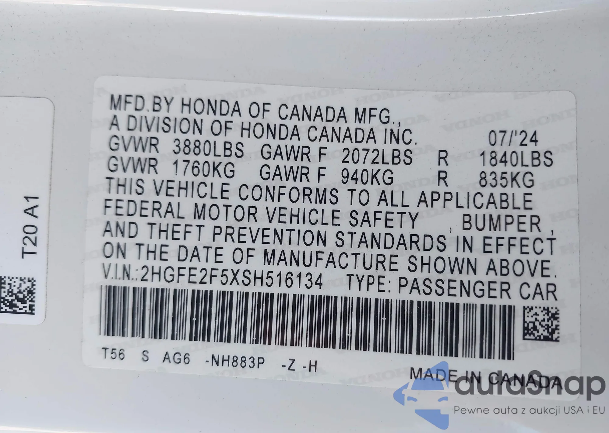 VIN: 2HGFE2F5XSH516134
