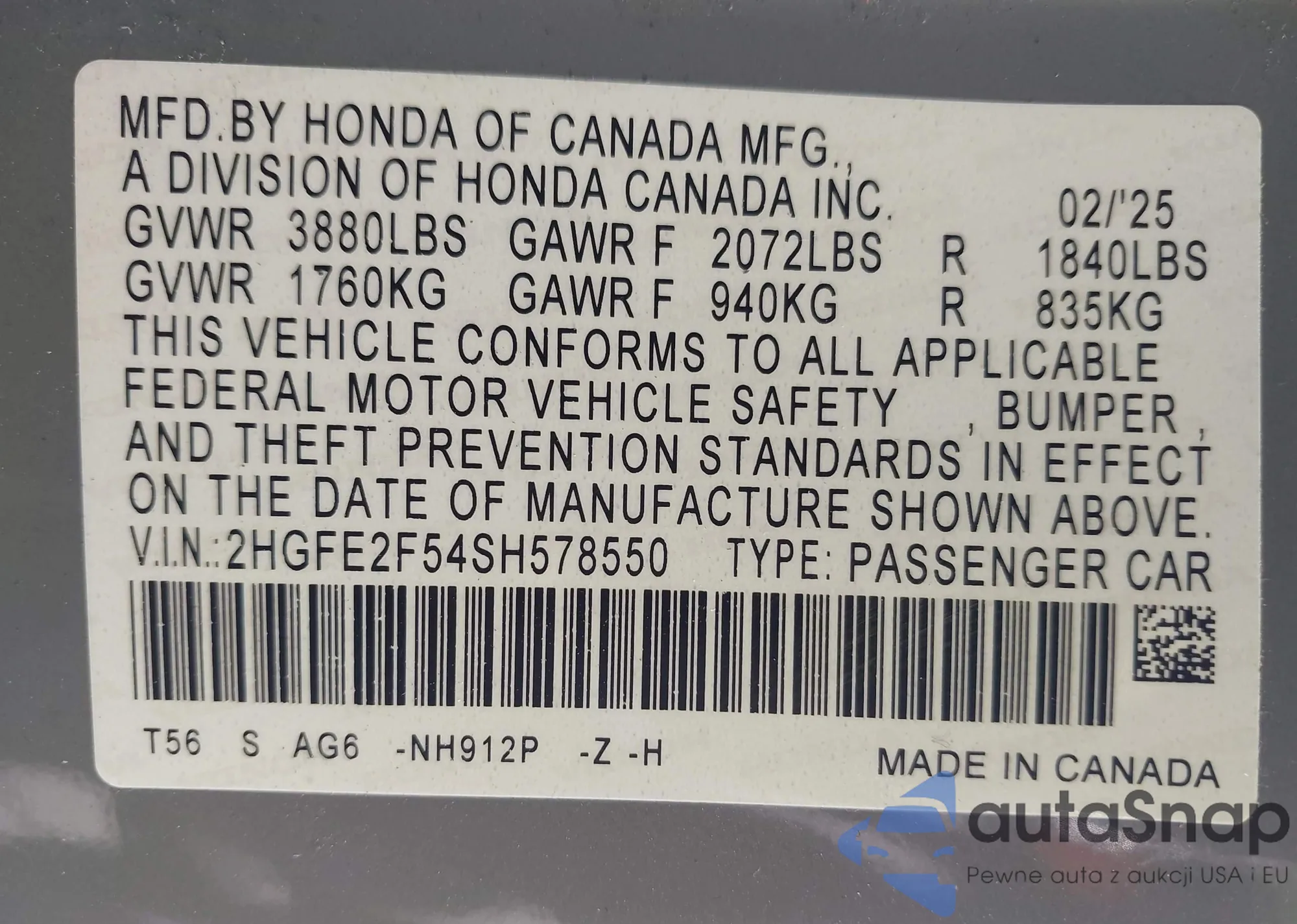 Автомобиль Honda Civic 2025 (VIN 2HGFE2F54SH578550) ранее не участвовал в торгах. Документы чистые, пробег соответствует или ниже среднего по рынку. Продаётся страховой компанией — рекомендуем покупку. Доставка в порт займет около 6–8 недель.