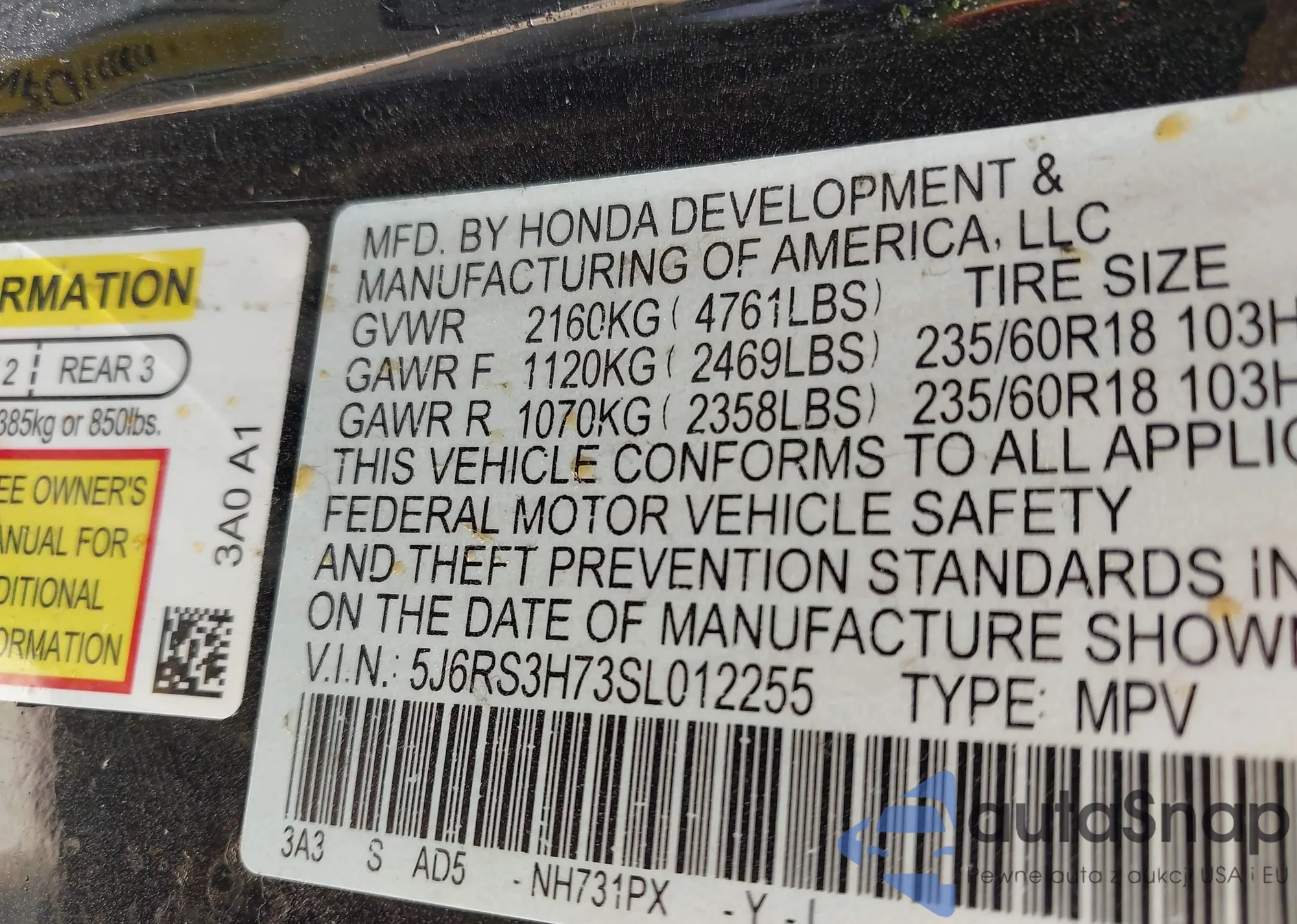 VIN: 5J6RS3H73SL012255