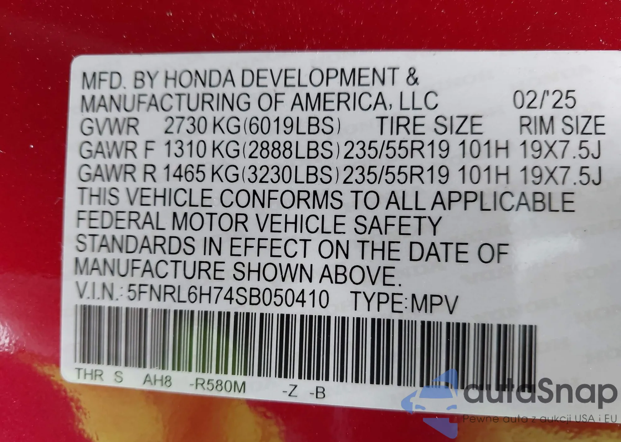 VIN: 5FNRL6H74SB050410