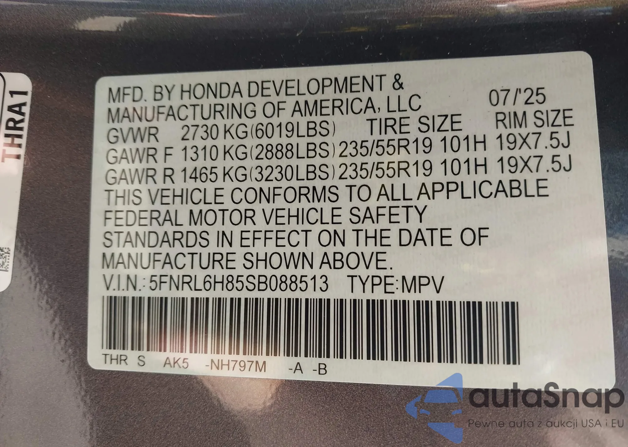• VIN: 5FNRL6H85SB088513