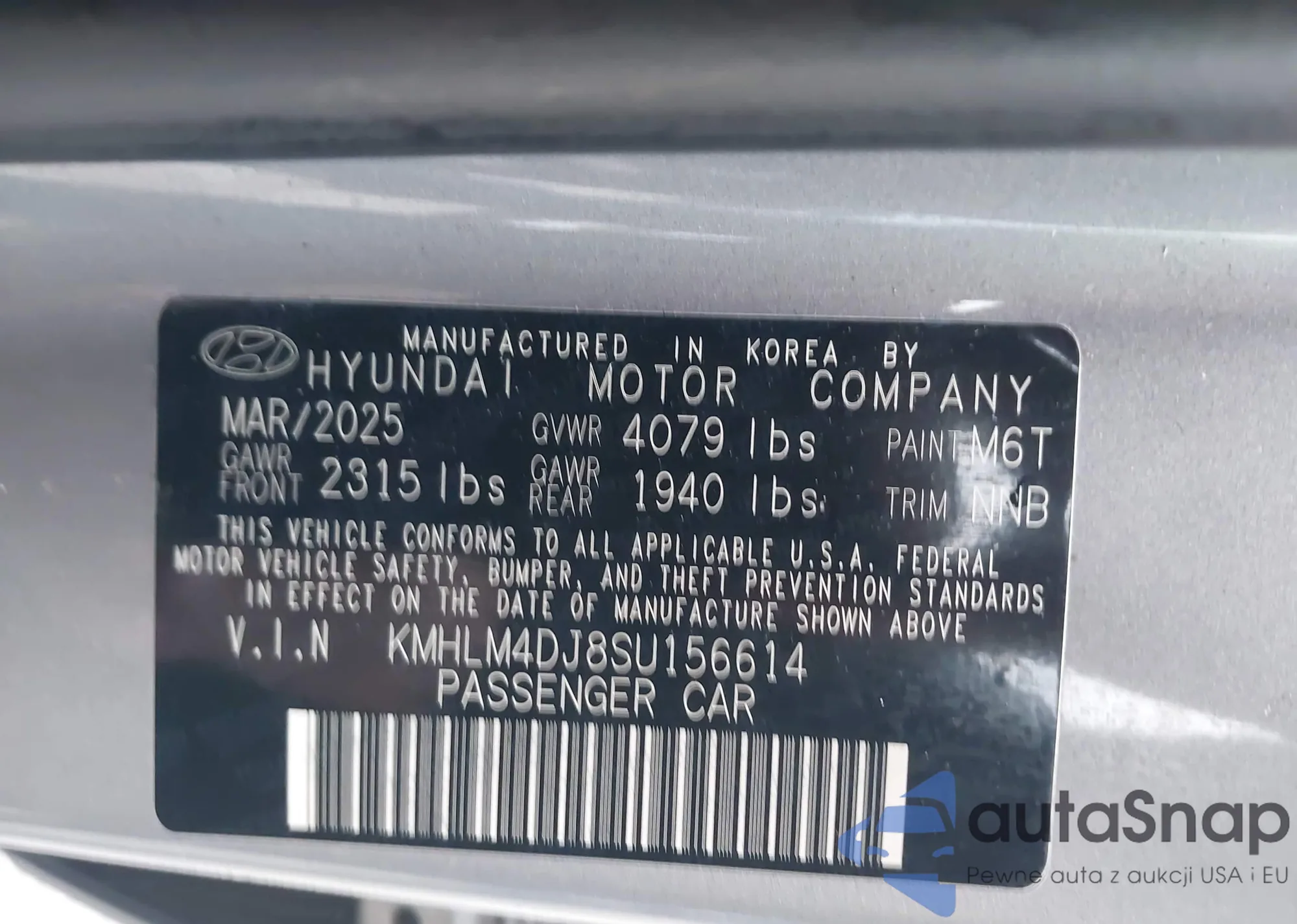 Автомобиль Hyundai Elantra 2025 (VIN KMHLM4DJ8SU156614) ранее не участвовал в торгах. Документы чистые, пробег соответствует или ниже среднего по рынку. Продаётся страховой компанией — рекомендуем покупку. Доставка в порт займет около 6–8 недель.