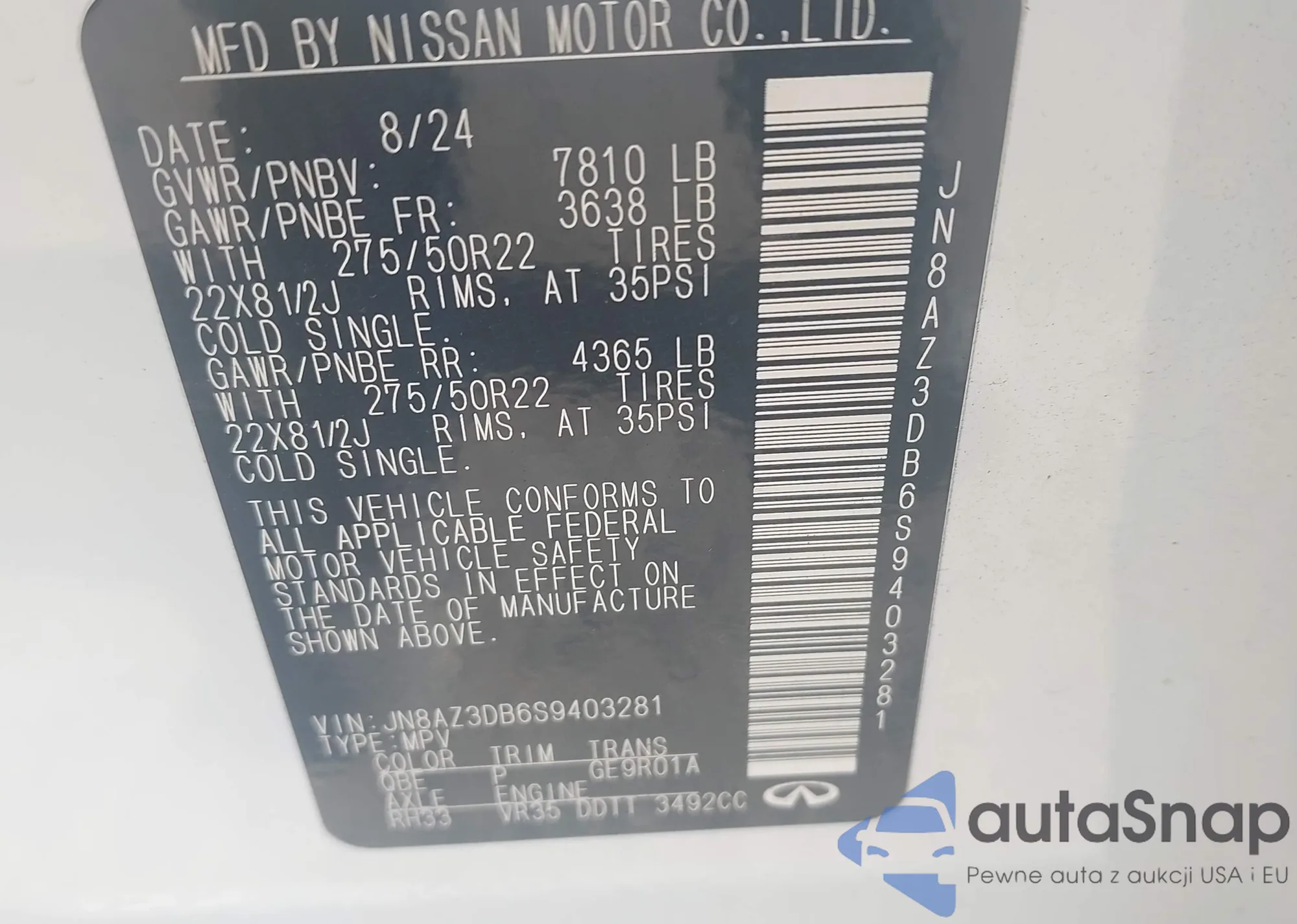 Автомобиль Infiniti QX80 2025 (VIN JN8AZ3DB6S9403281) ранее не участвовал в торгах. Документы чистые, пробег соответствует или ниже среднего по рынку. Продаётся страховой компанией — рекомендуем покупку. Доставка в порт займет около 6–8 недель.
