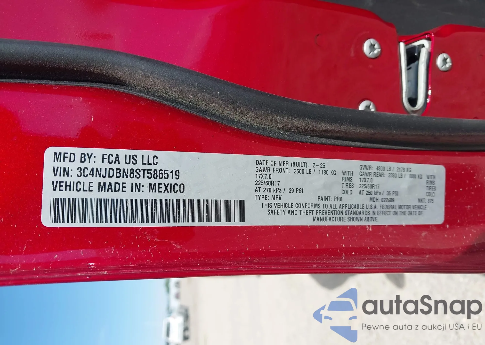 Автомобиль Jeep Compass 2025 (VIN 3C4NJDBN8ST586519) ранее не участвовал в торгах. Документы чистые, пробег соответствует или ниже среднего по рынку. Продаётся страховой компанией — рекомендуем покупку. Доставка в порт займет около 6–8 недель.