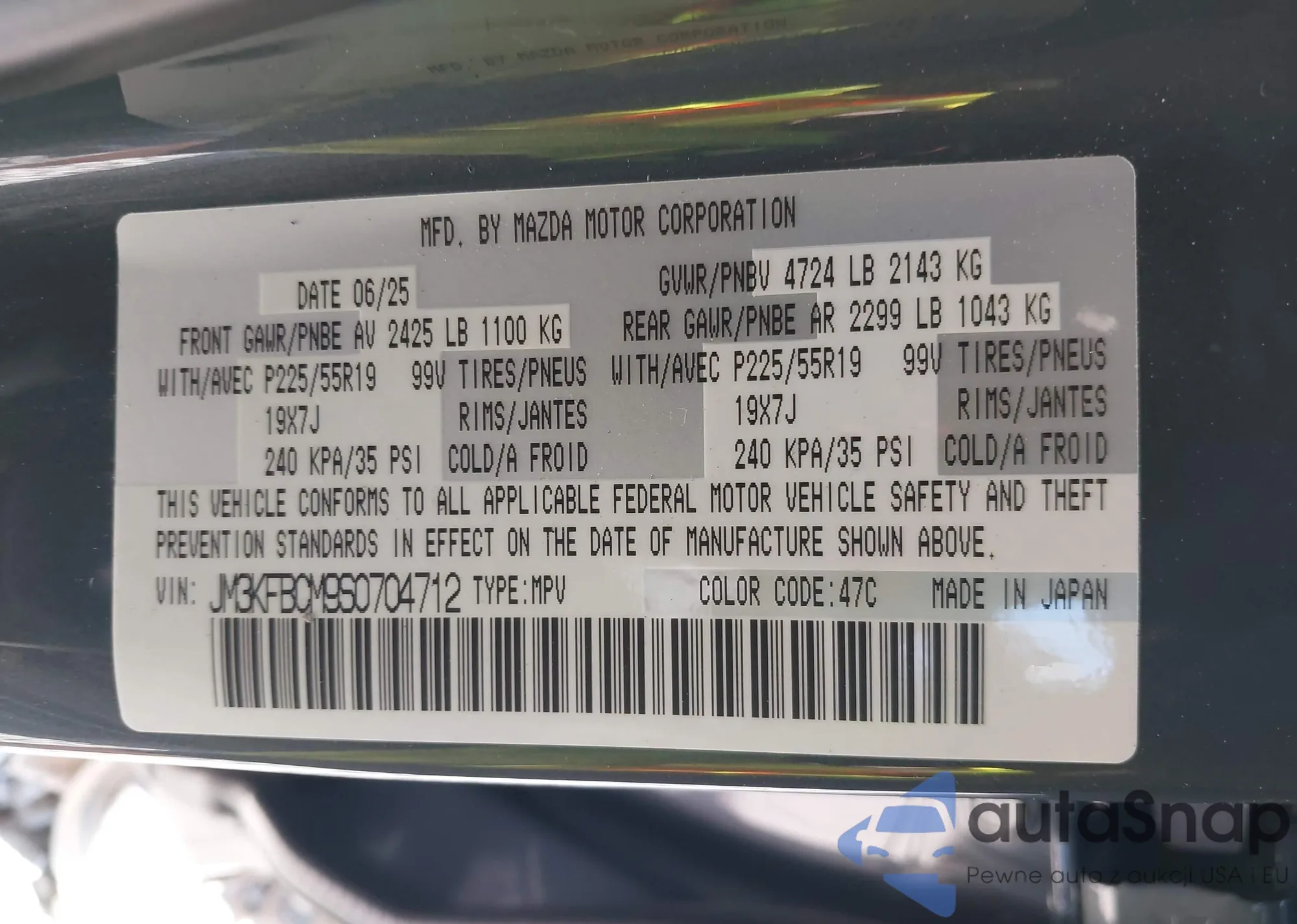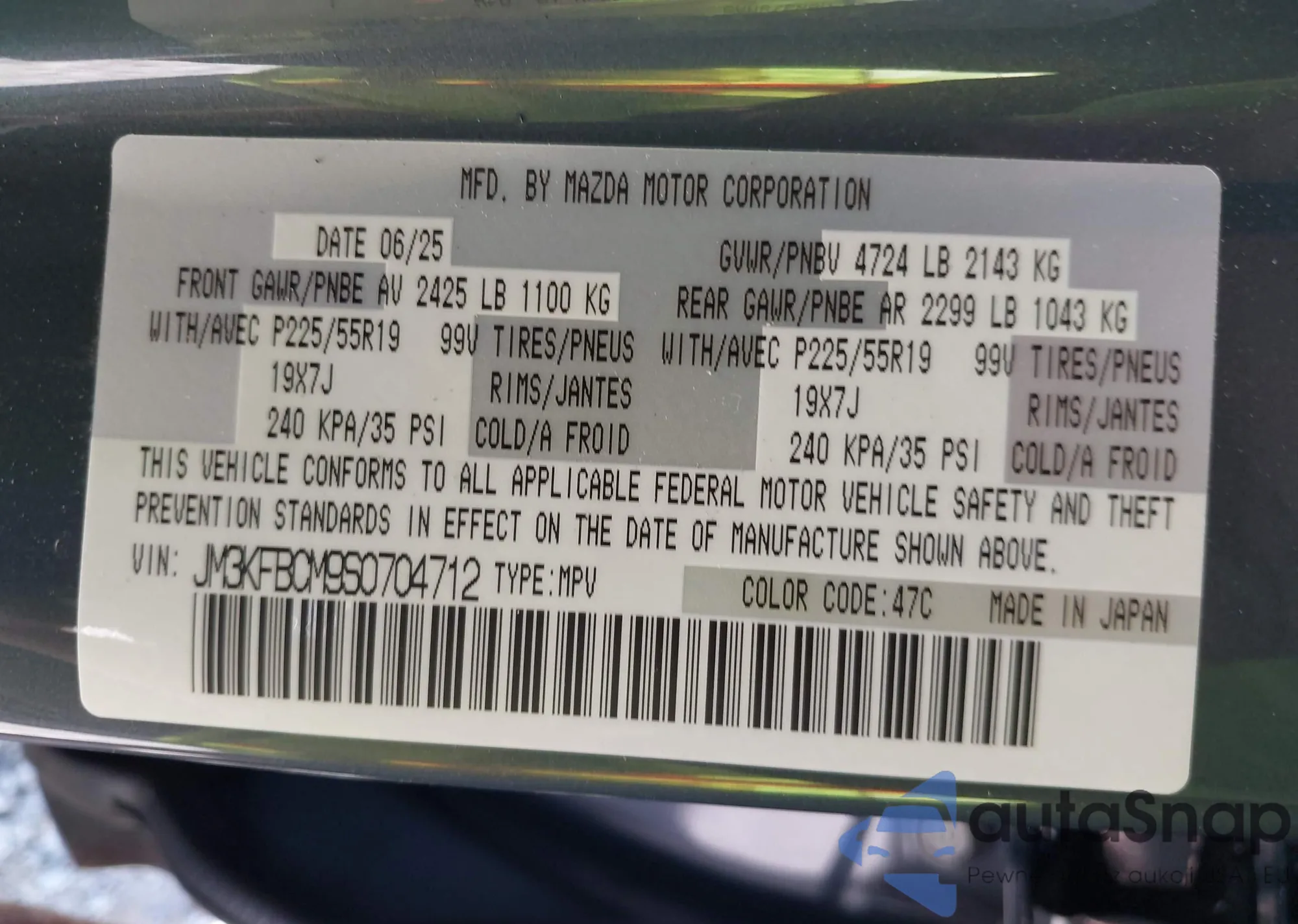 Автомобиль Mazda CX-5 2025 (VIN JM3KFBCM9S0704712) имеет документы, препятствующие регистрации. Могут возникнуть сложности при экспорте и регистрации. Обратитесь к экспертам AutaSnap для поиска альтернатив.
