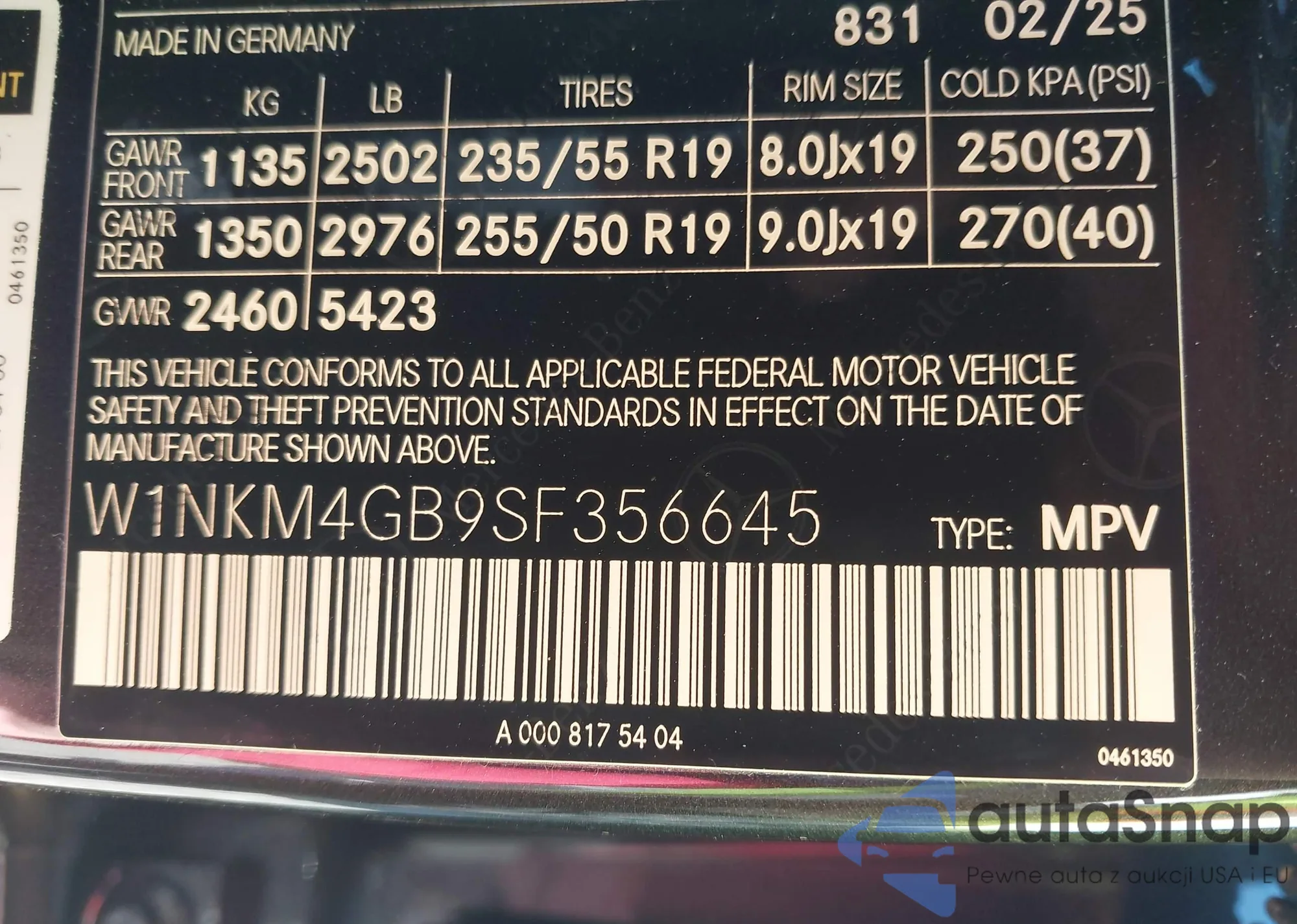 • VIN: W1NKM4GB9SF356645