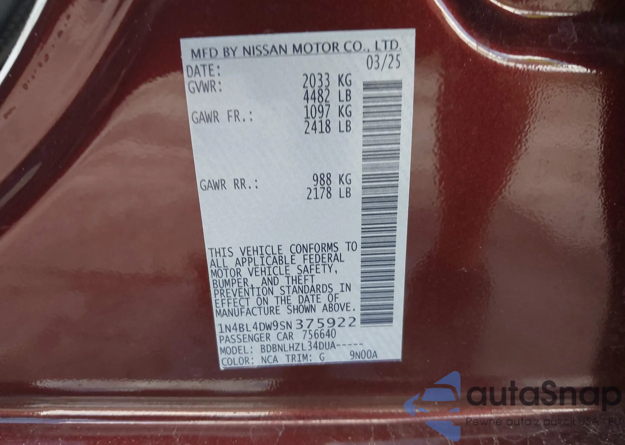 VIN: 1N4BL4DW9SN375922