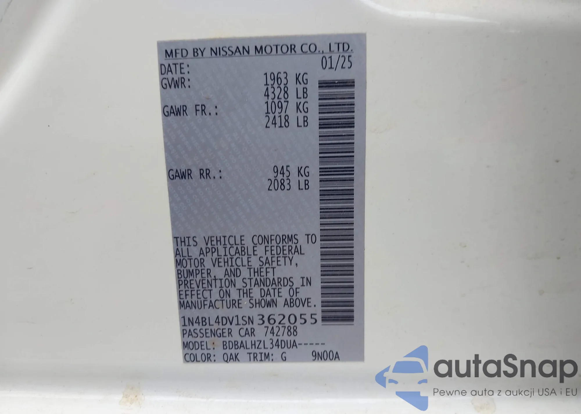 VIN: 1N4BL4DV1SN362055