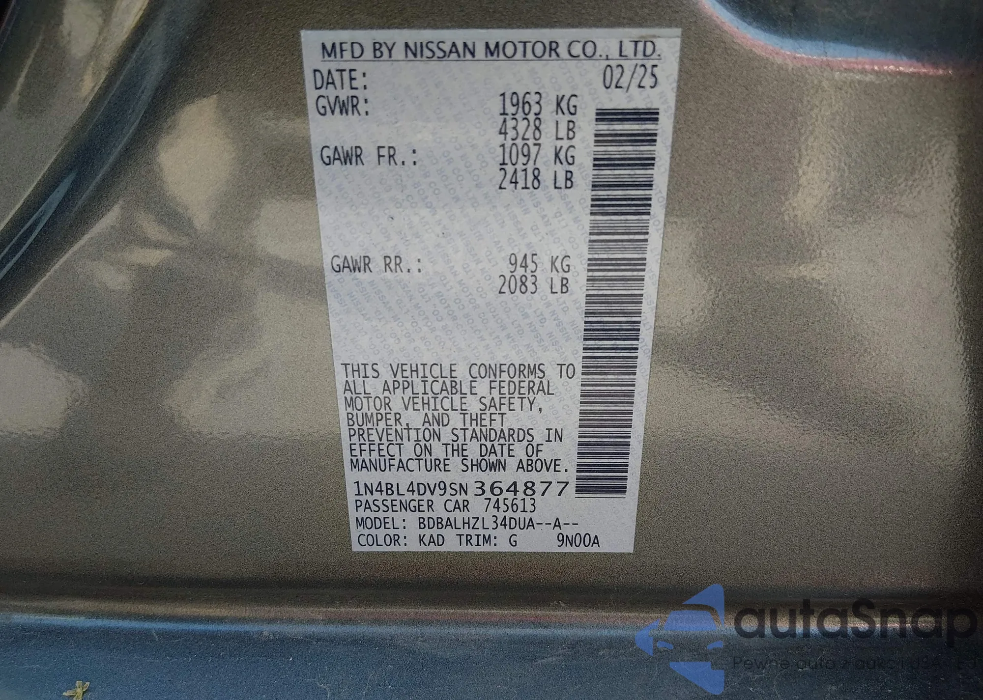 VIN: 1N4BL4DV9SN364877