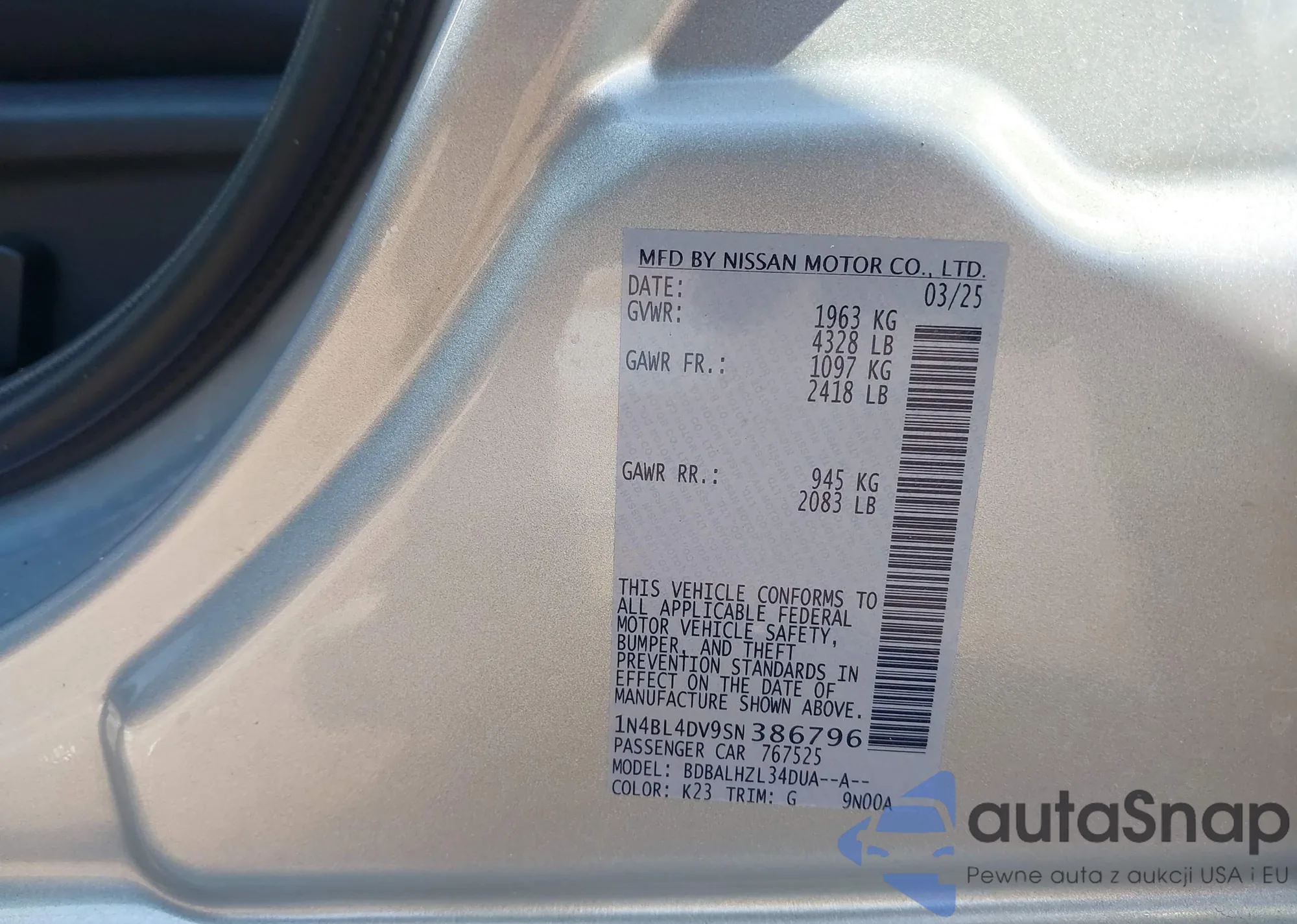 VIN: 1N4BL4DV9SN386796