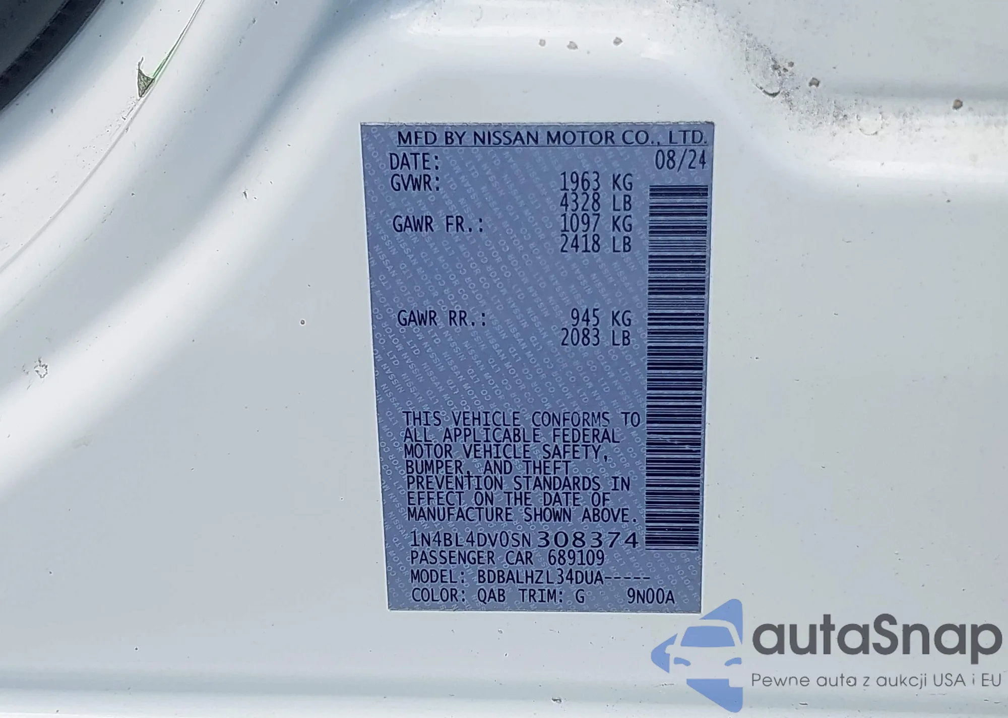 VIN: 1N4BL4DV0SN308374