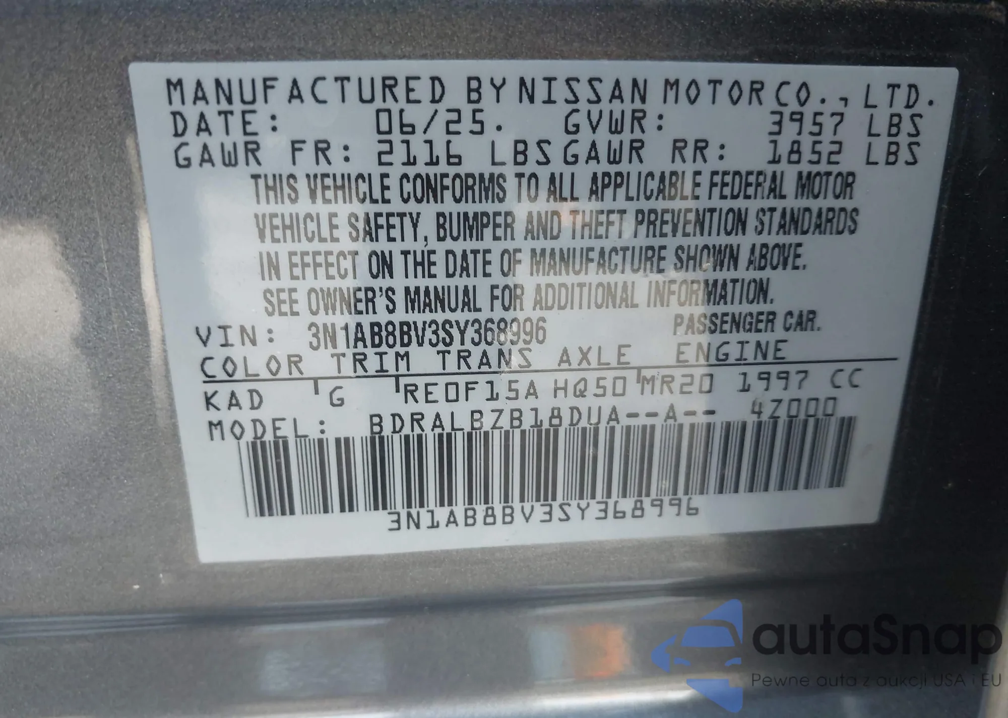 VIN: 3N1AB8BV3SY368996