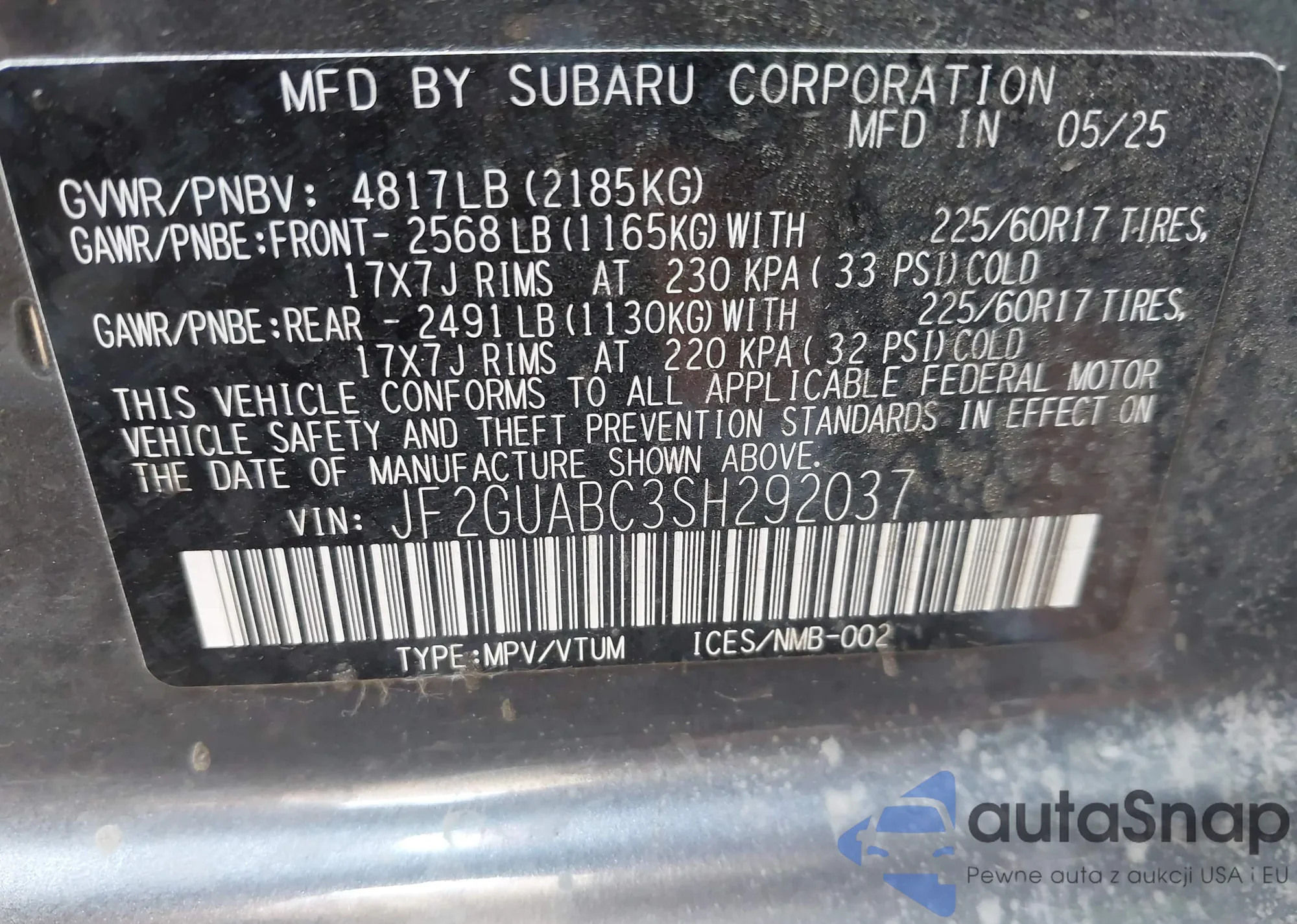 VIN: JF2GUABC3SH292037
