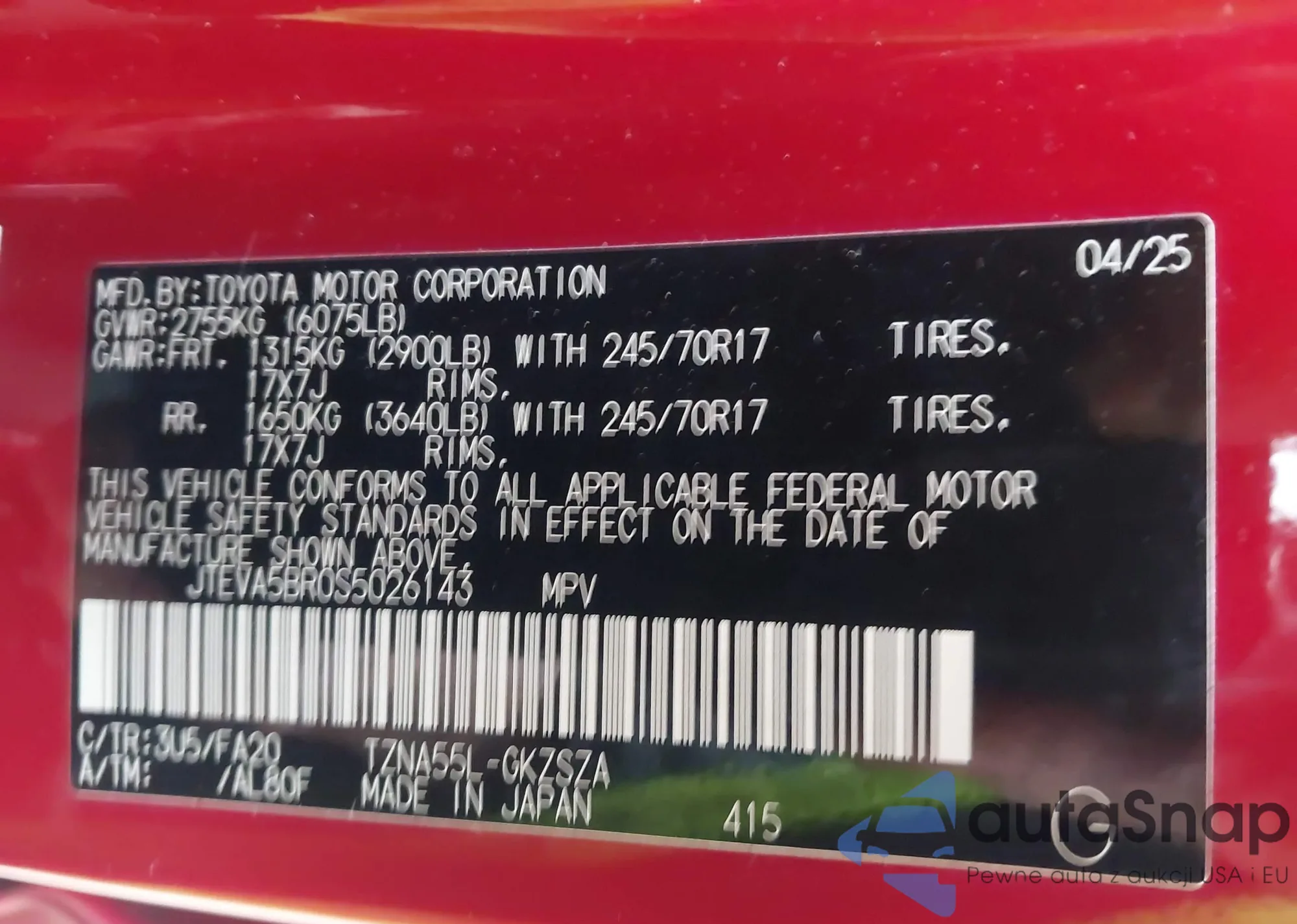 Автомобиль Toyota 4Runner 2025 (VIN JTEVA5BR0S5026143) ранее не участвовал в торгах. Документы чистые, пробег соответствует или ниже среднего по рынку. Продаётся страховой компанией — рекомендуем покупку. Доставка в порт займет около 6–8 недель.