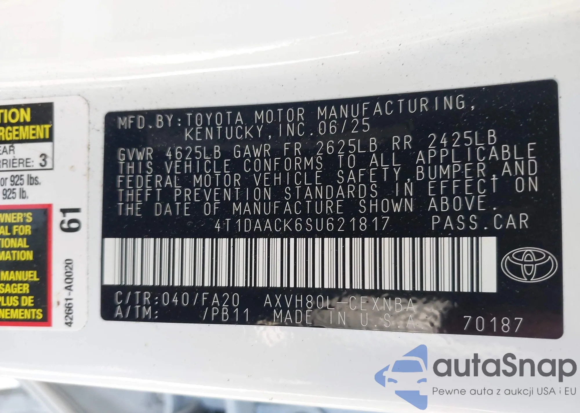 • VIN: 4T1DAACK6SU621817