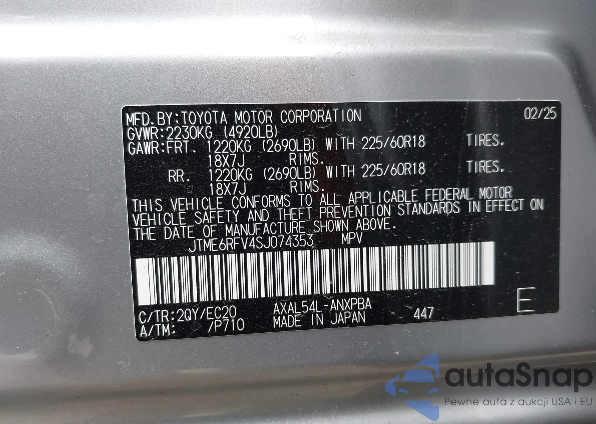 Автомобиль Toyota RAV 4 2025 (VIN JTME6RFV4SJ074353) ранее не участвовал в торгах. Документы чистые, пробег соответствует или ниже среднего по рынку. Продаётся страховой компанией — рекомендуем покупку. Доставка в порт займет около 6–8 недель.