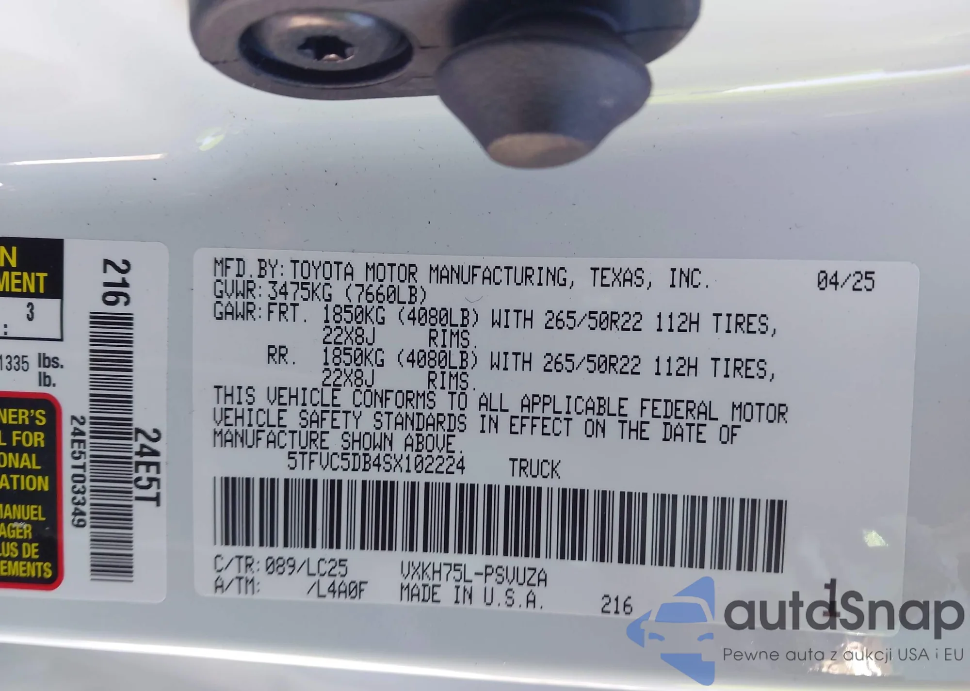 Автомобиль Toyota Tundra 2025 (VIN 5TFVC5DB4SX102224) ранее не участвовал в торгах. Документы чистые, пробег соответствует или ниже среднего по рынку. Продаётся страховой компанией — рекомендуем покупку. Доставка в порт займет около 6–8 недель.