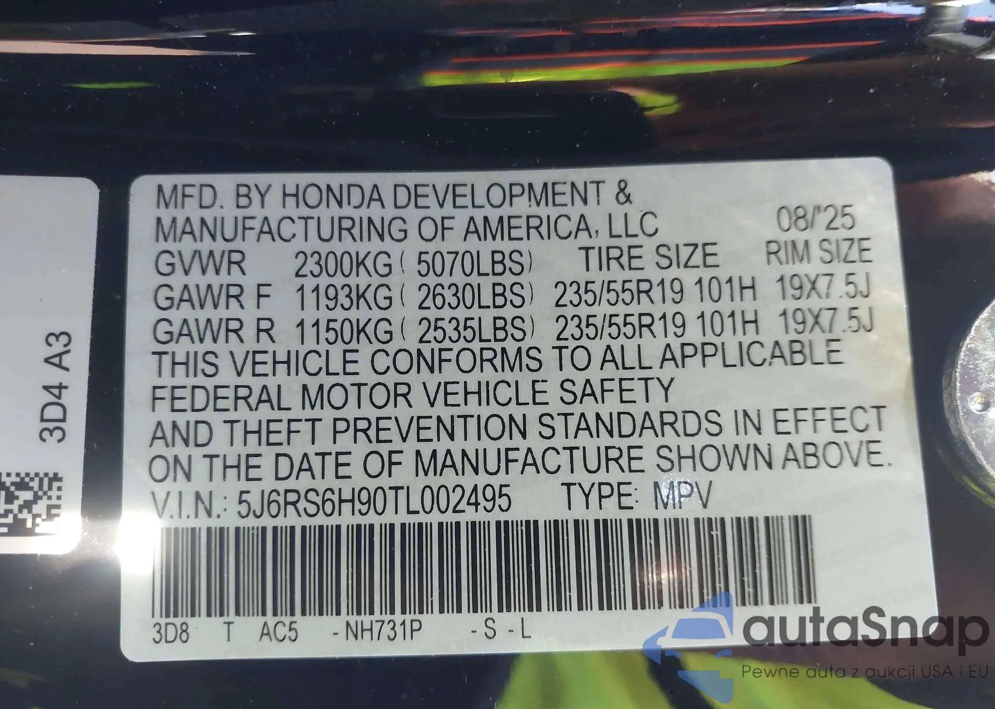Автомобиль Honda CR-V 2026 (VIN 5J6RS6H90TL002495) ранее не участвовал в торгах. Документы чистые, пробег соответствует или ниже среднего по рынку. Продаётся страховой компанией — рекомендуем покупку. Доставка в порт займет около 6–8 недель.