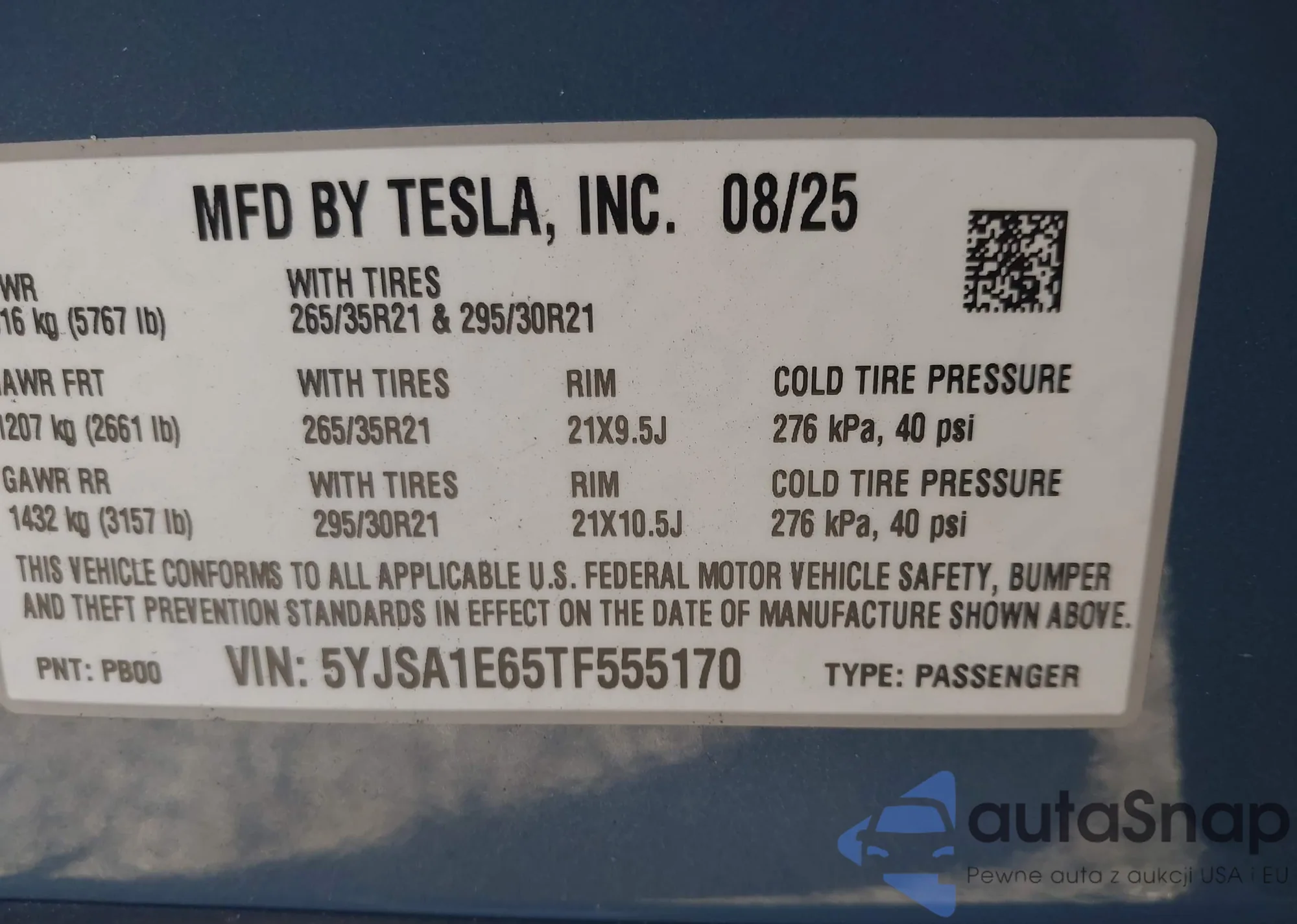 Автомобиль Tesla Model S 2026 (VIN 5YJSA1E65TF555170) ранее не участвовал в торгах. Документы чистые, пробег соответствует или ниже среднего по рынку. Продаётся страховой компанией — рекомендуем покупку. Доставка в порт займет около 6–8 недель.