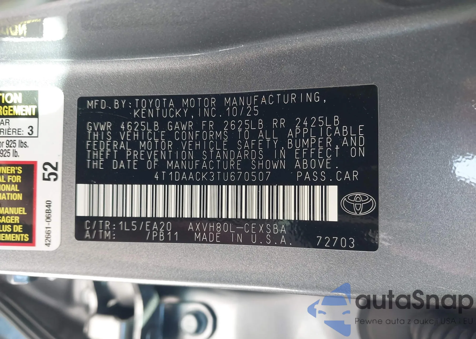 Автомобиль Toyota Camry 2026 (VIN 4T1DAACK3TU670507) имеет документы, препятствующие регистрации. Могут возникнуть сложности при экспорте и регистрации. Обратитесь к экспертам AutaSnap для поиска альтернатив.