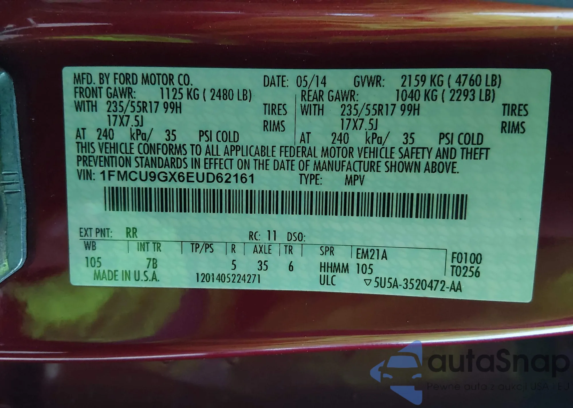 • VIN 1FMCU9GX6EUD62161
