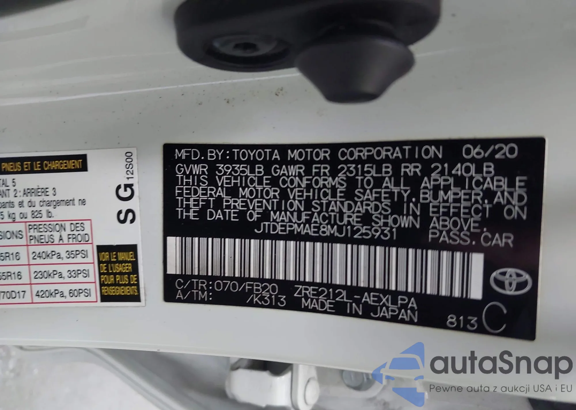 LOT: 42870156 VIN: JTDEPMAE8MJ125931