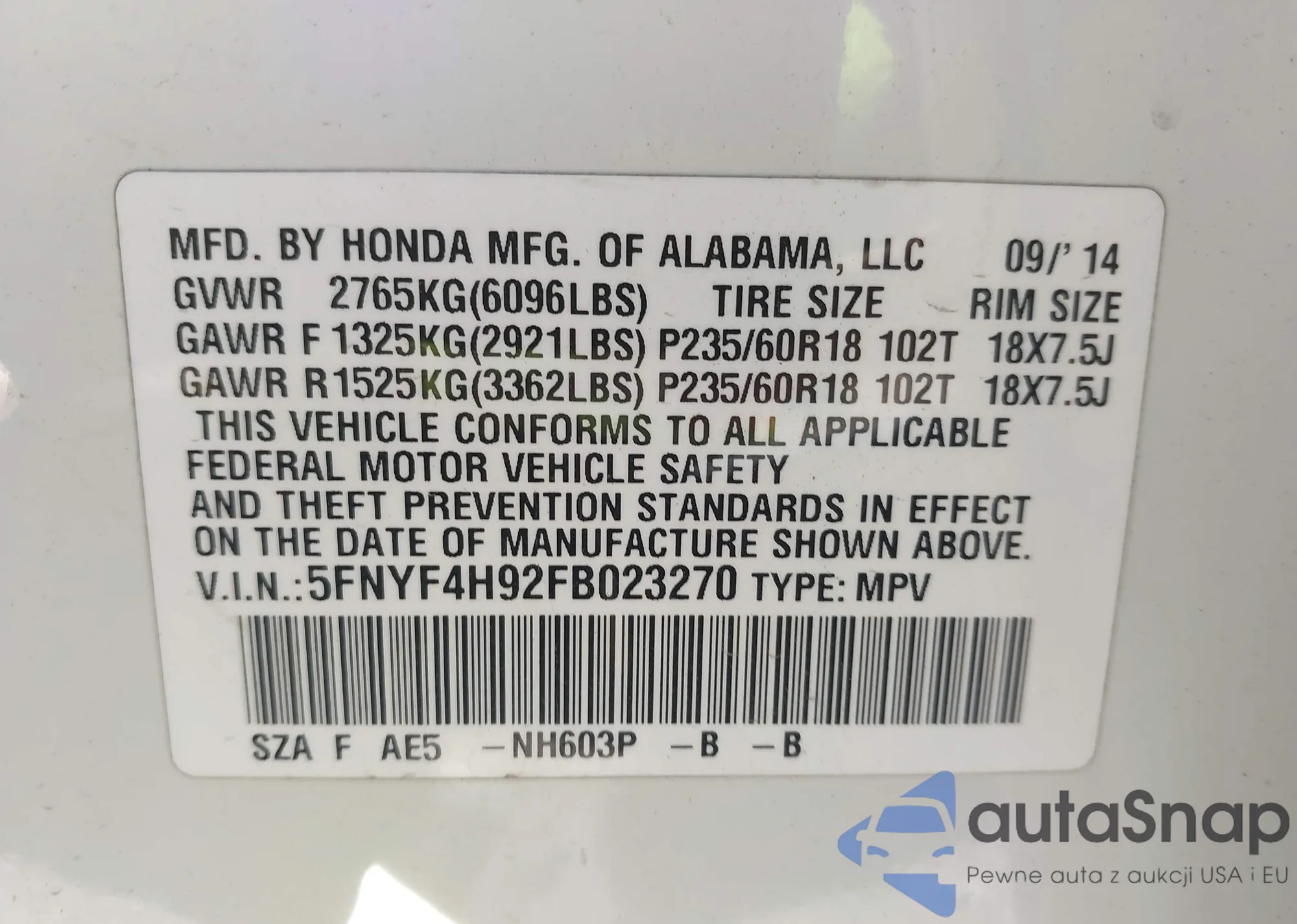 LOT: 43409111 VIN: 5FNYF4H92FB023270