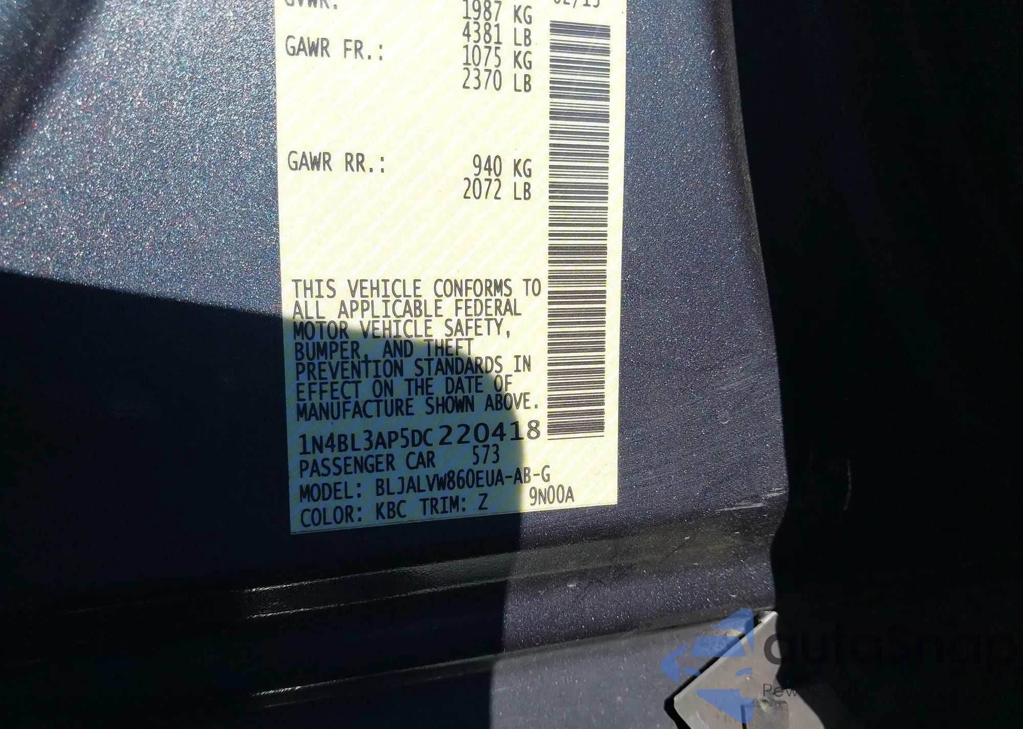 • VIN 1N4BL3AP5DC220418