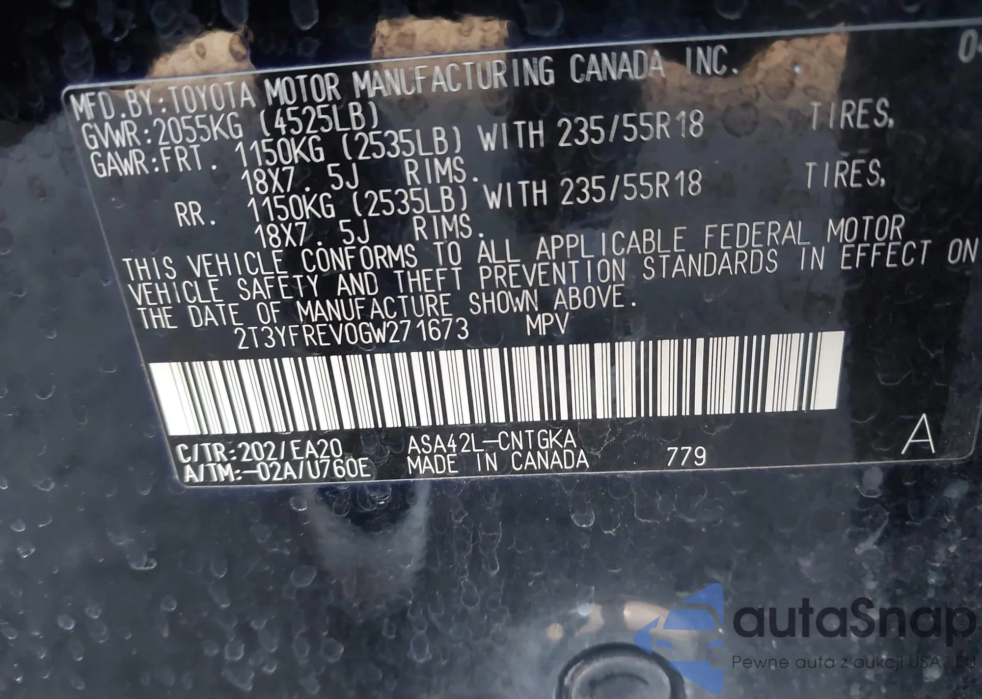 LOT: 43733533 VIN: 2T3YFREV0GW271673