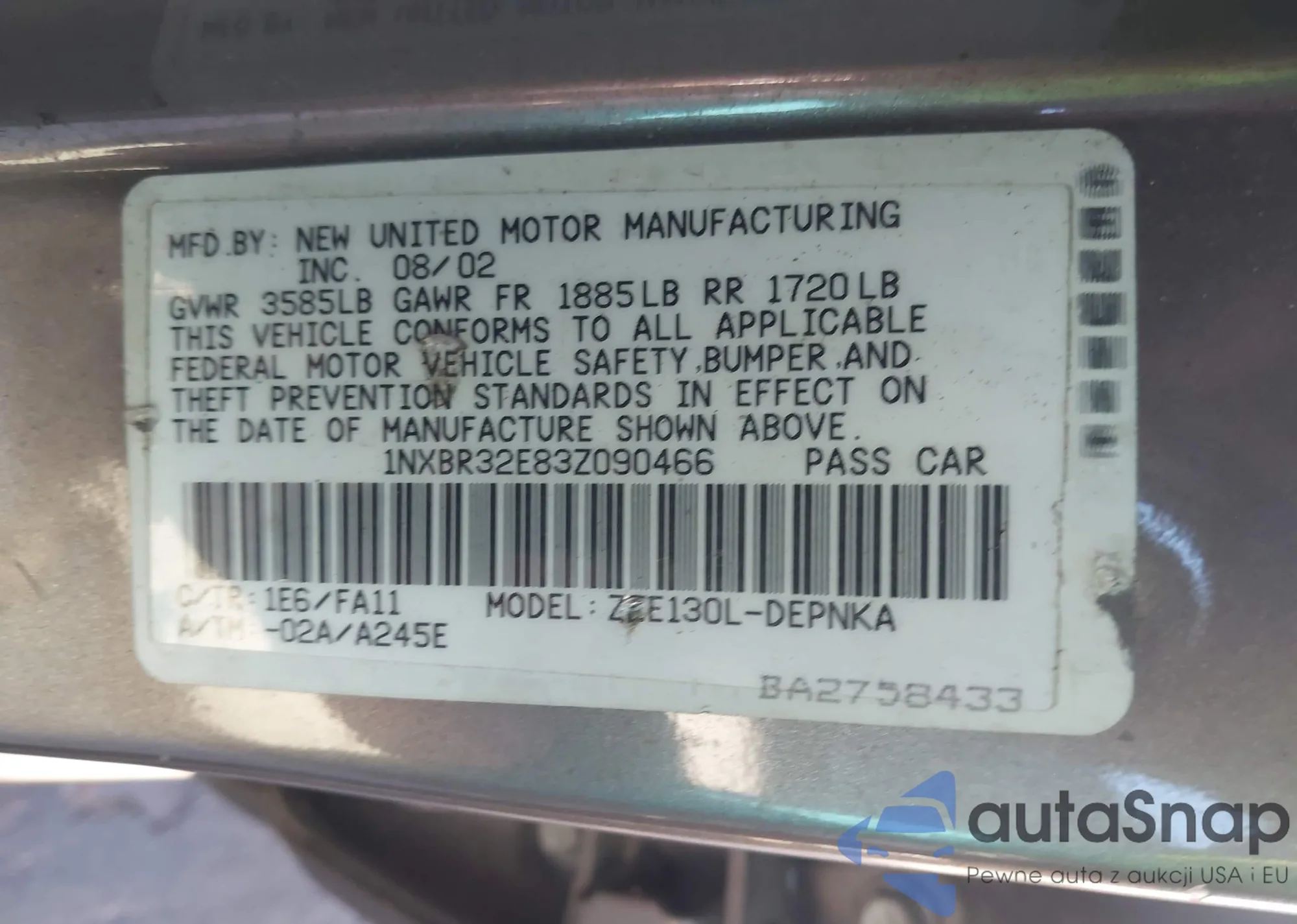 • VIN 1NXBR32E83Z090466