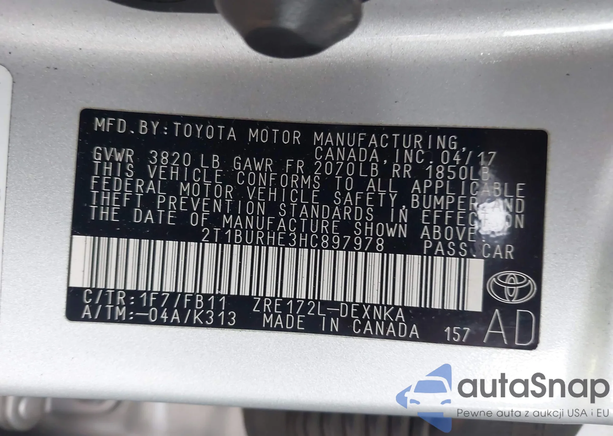 LOT: 43571817 VIN: 2T1BURHE3HC897978