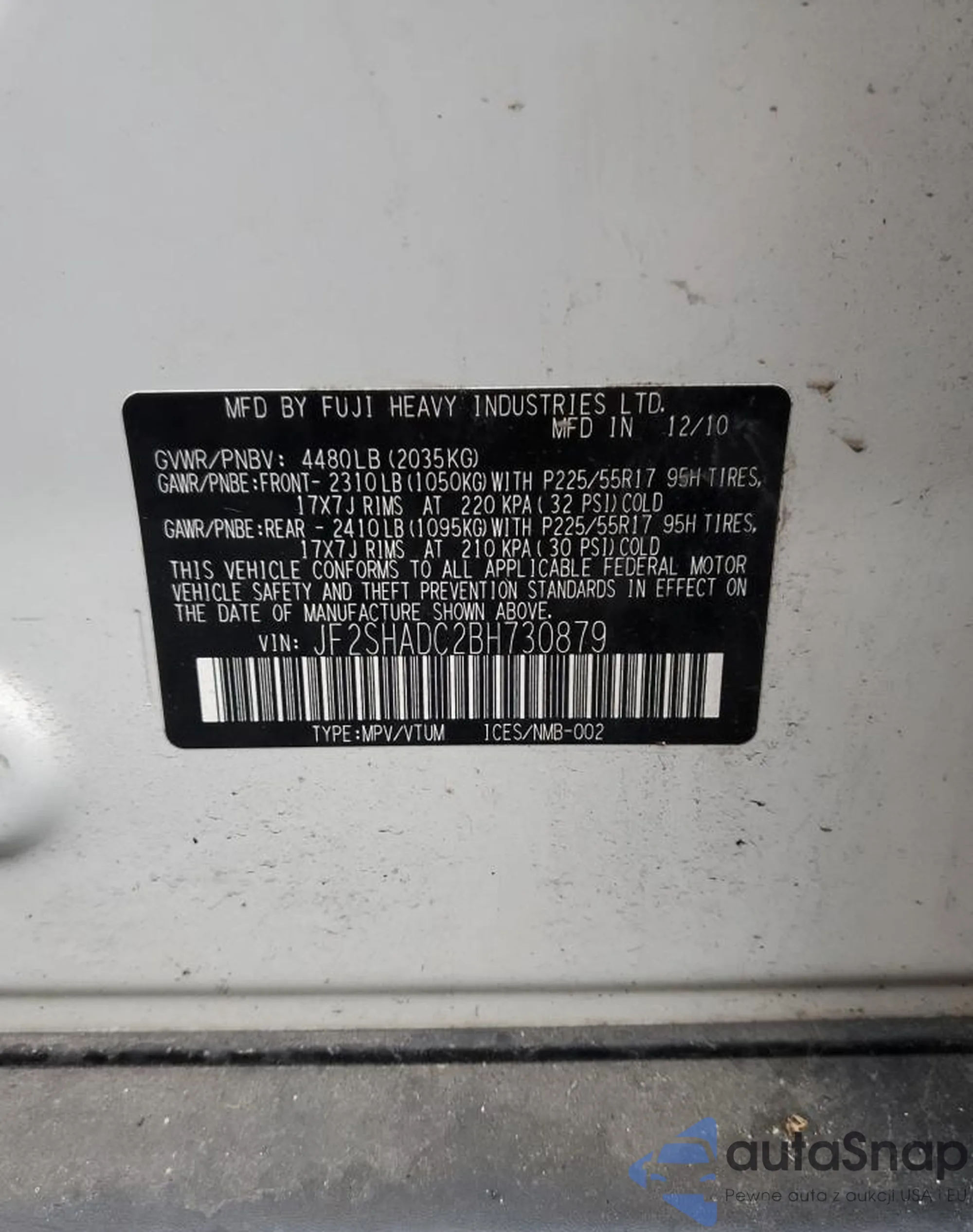 LOT: 85000425 VIN: JF2SHADC2BH730879
