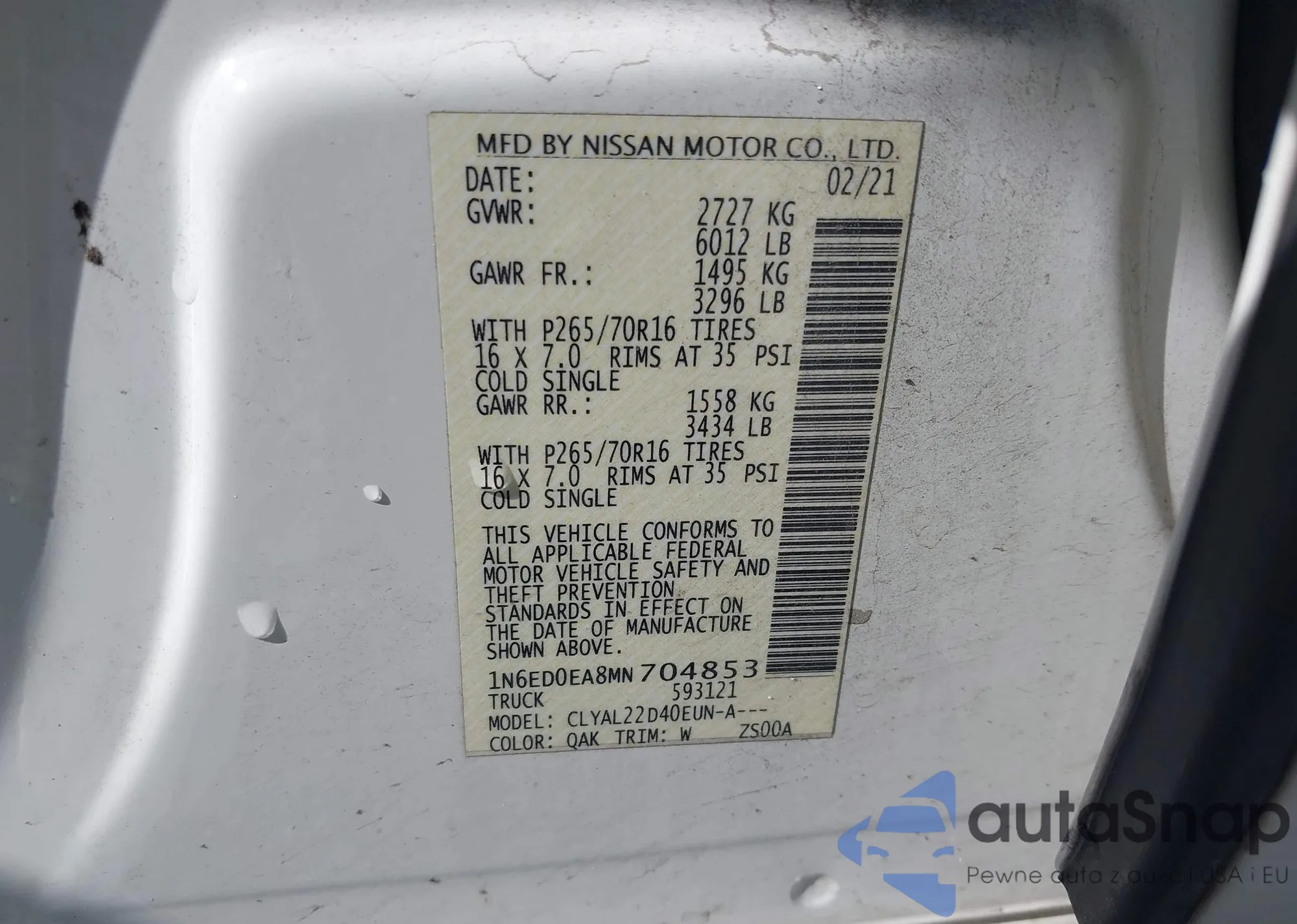 LOT: 43091315 VIN: 1N6ED0EA8MN704853