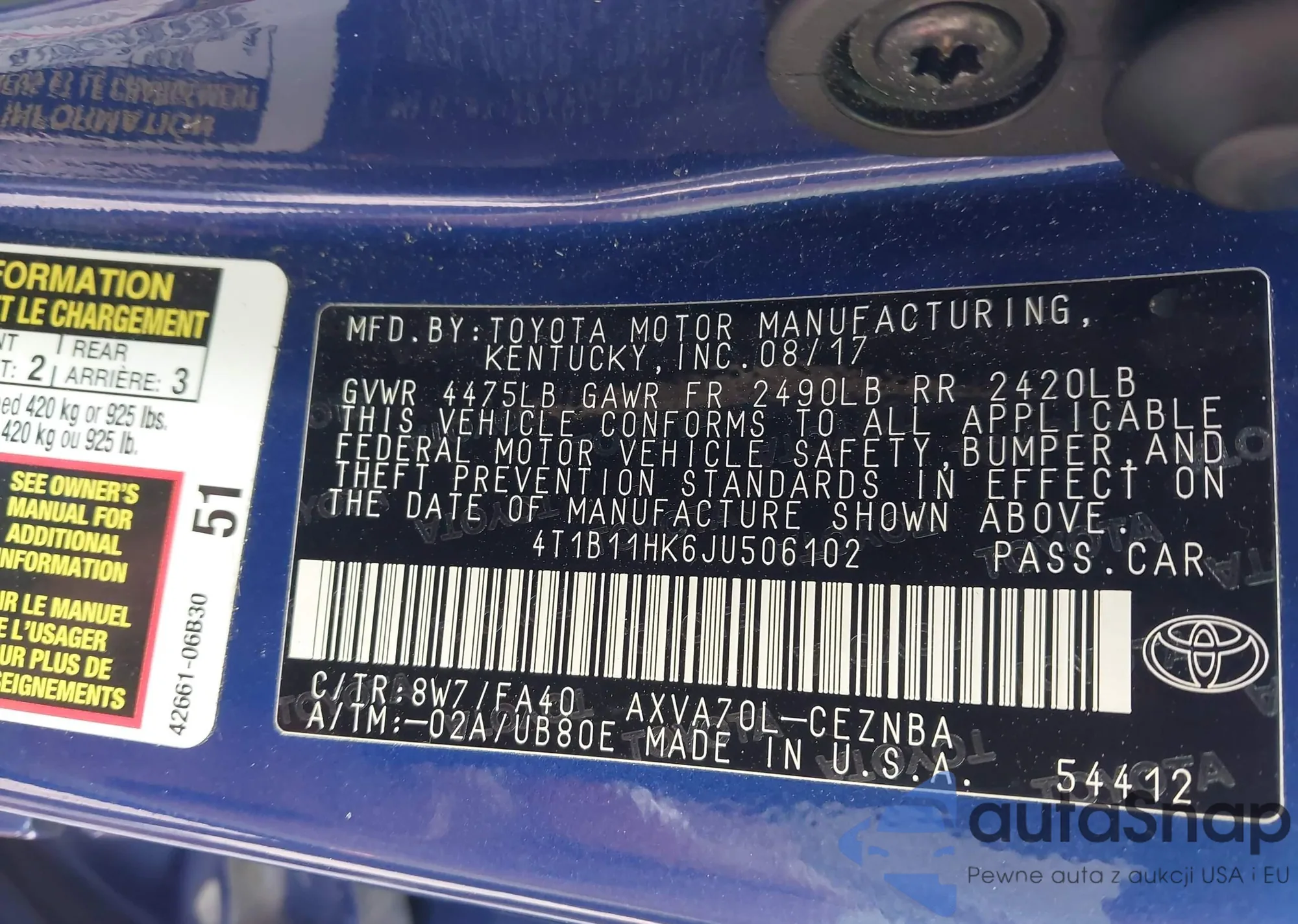 LOT: 43745367 VIN: 4T1B11HK6JU506102