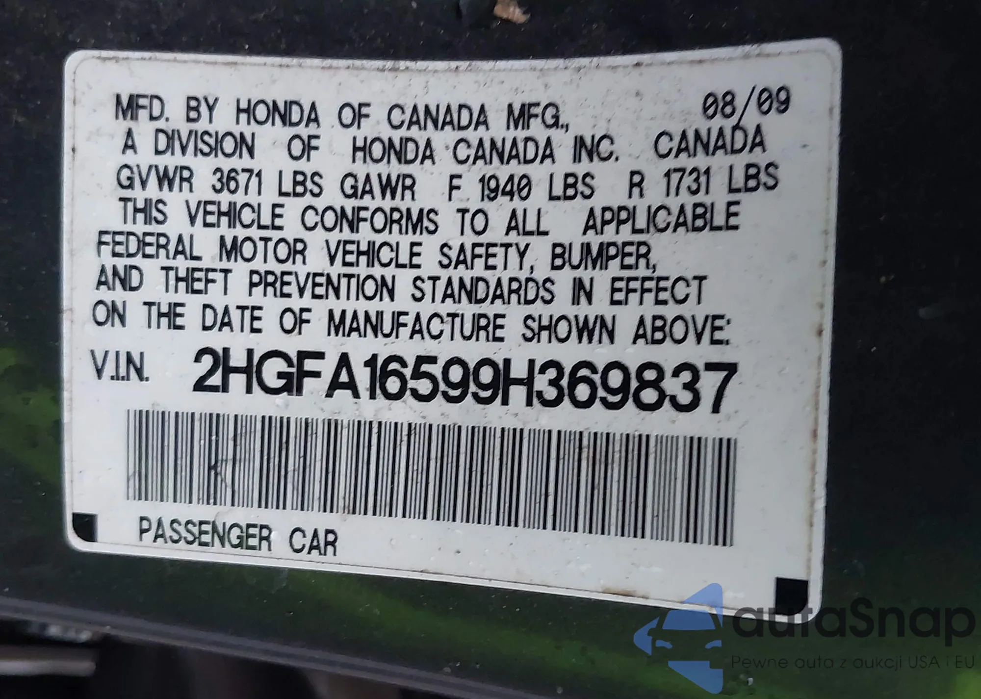 LOT: 43909436 VIN: 2HGFA16599H369837