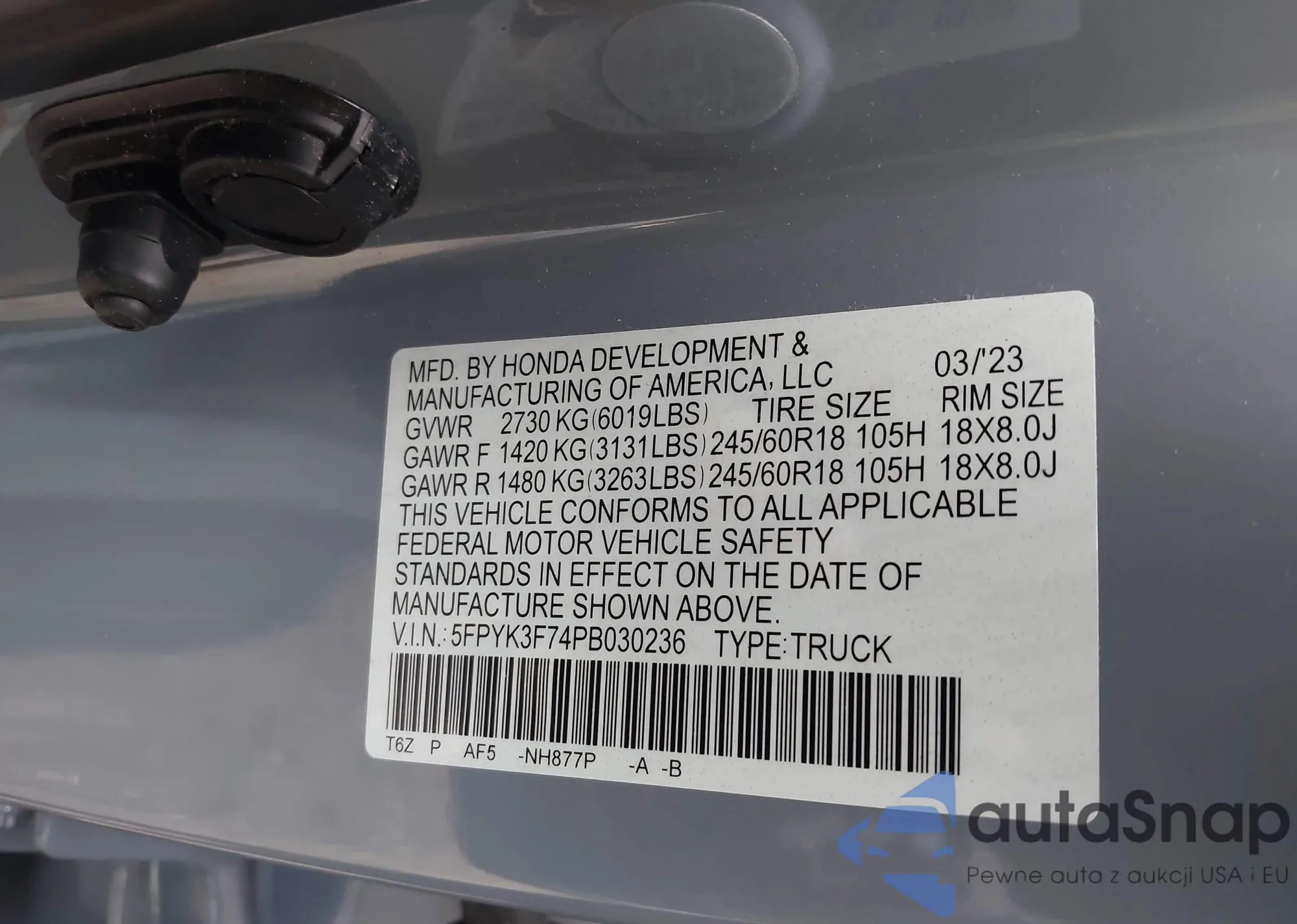 • VIN 5FPYK3F74PB030236