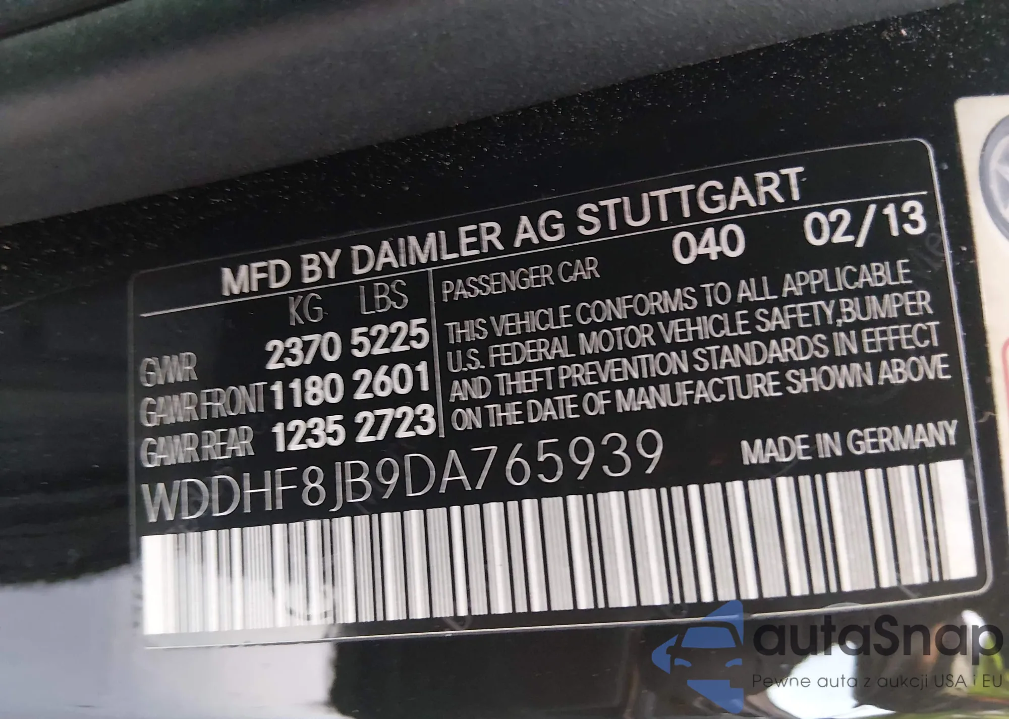 LOT: 44062429 VIN: WDDHF8JB9DA765939