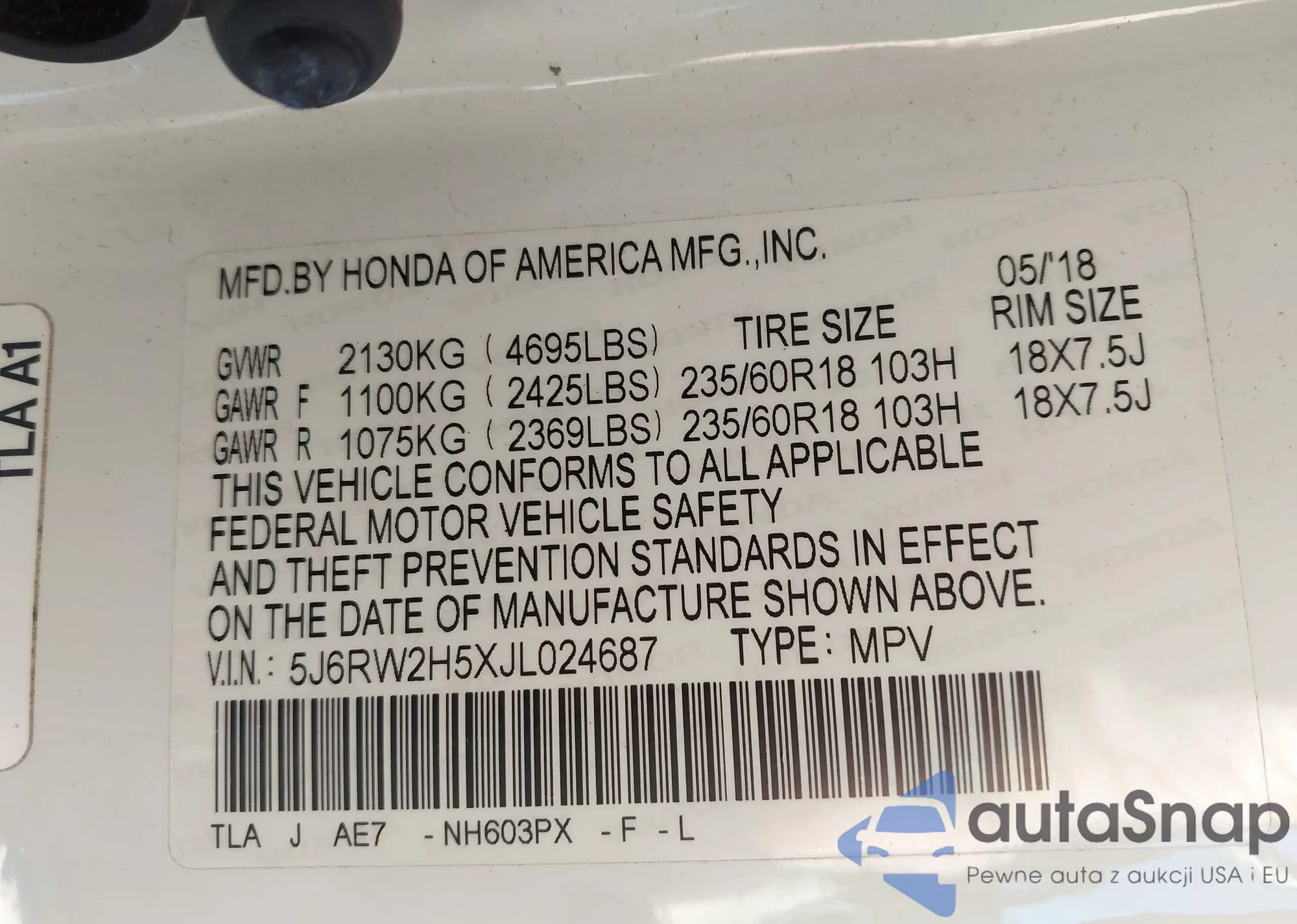 • VIN 5J6RW2H5XJL024687