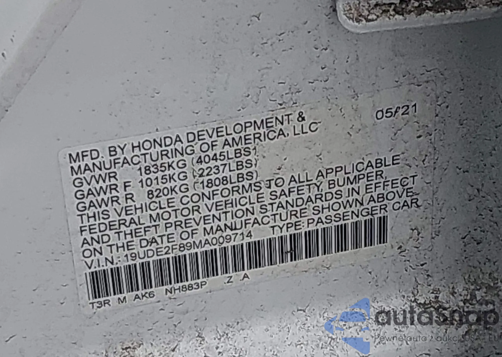 • VIN 19UDE2F89MA009714
