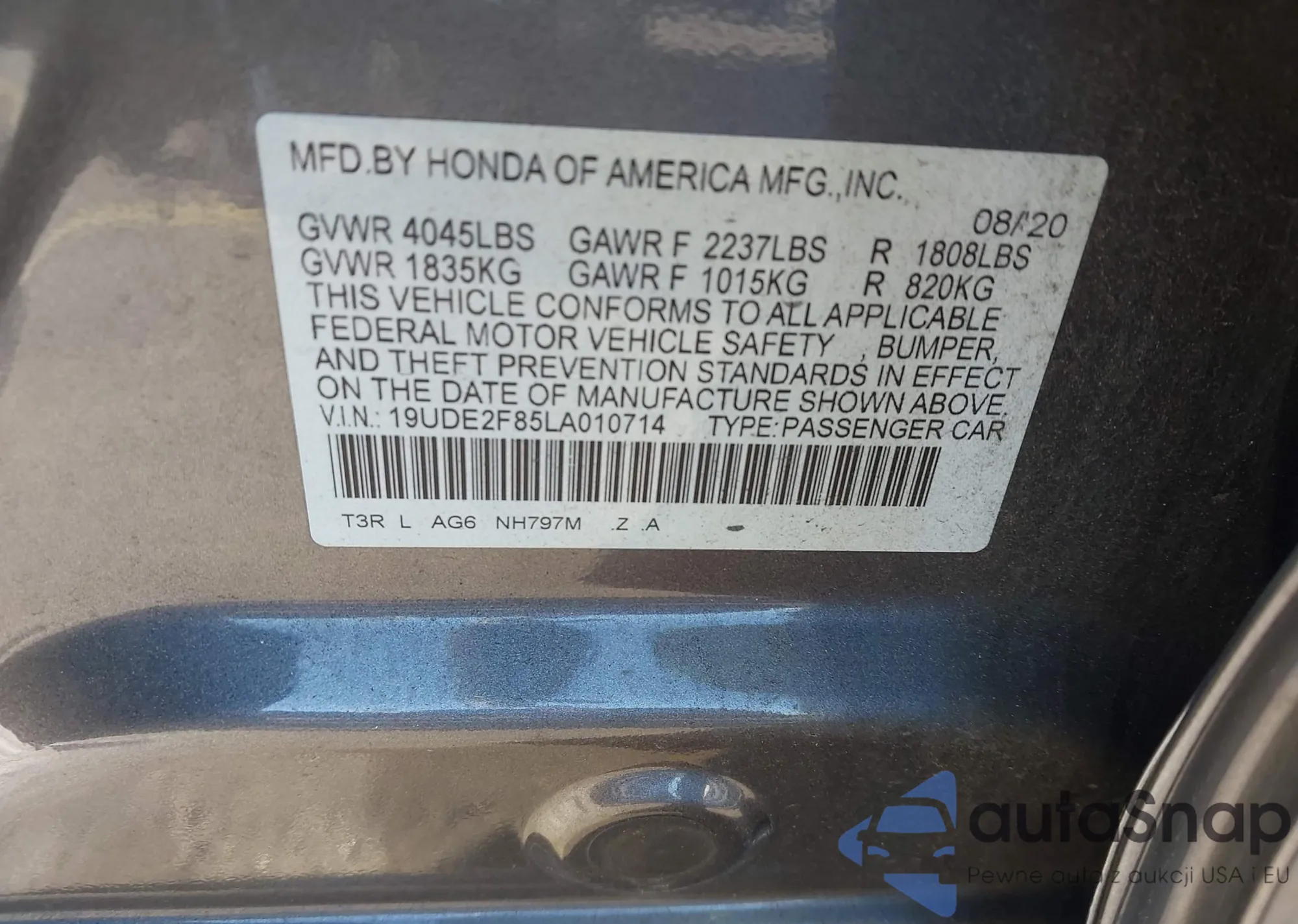 • VIN 19UDE2F85LA010714